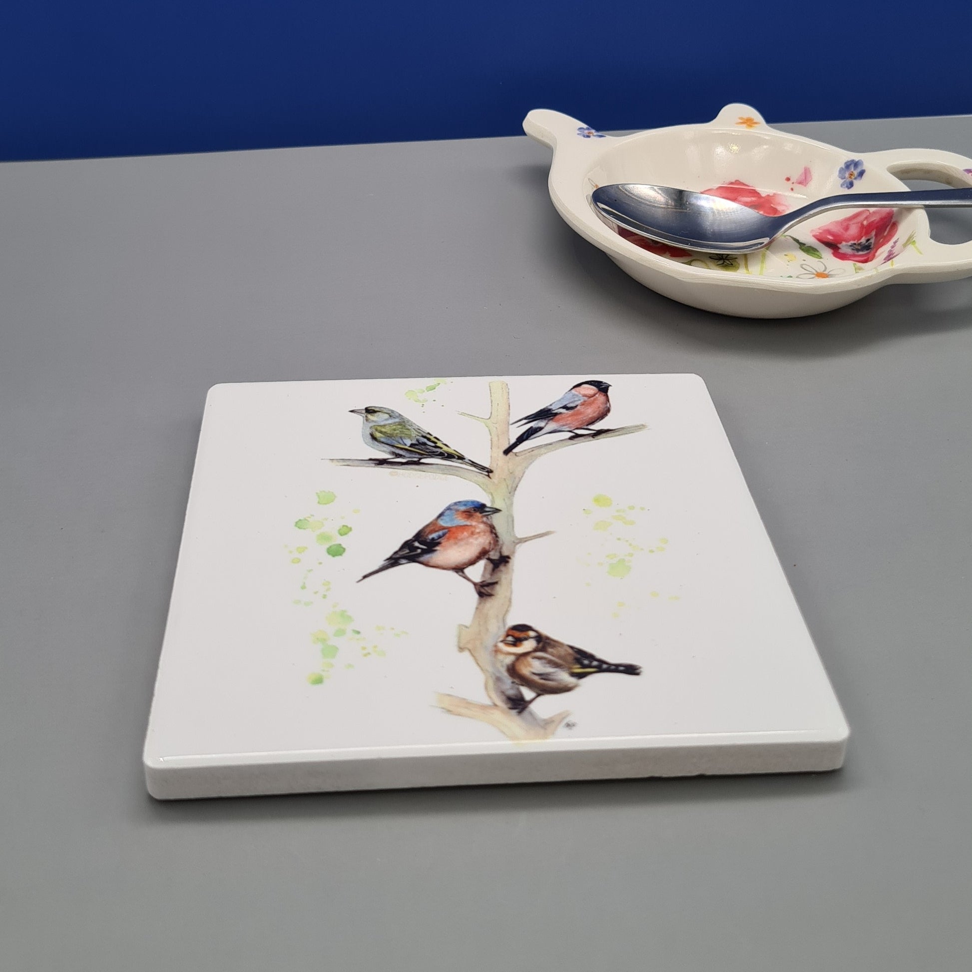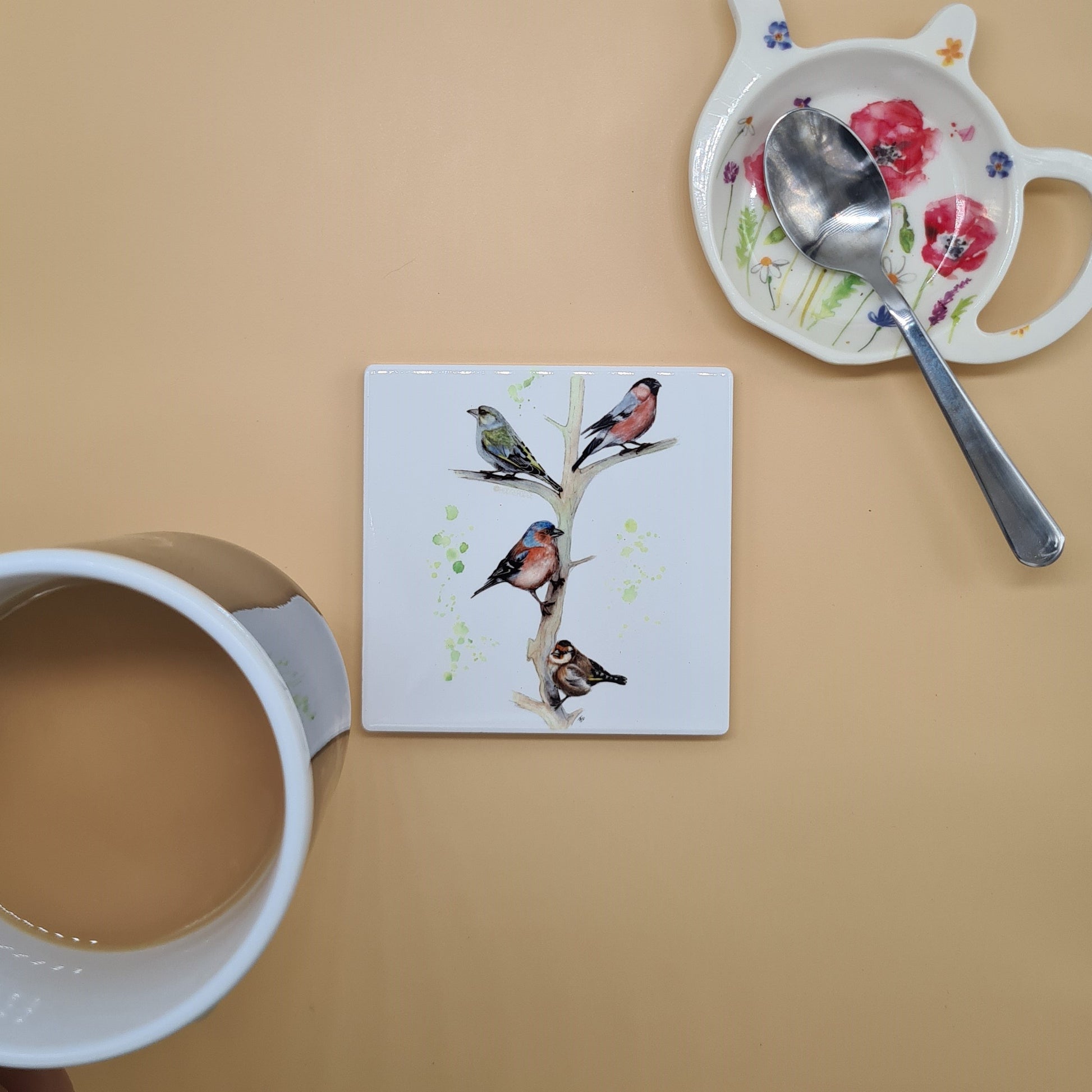 Beautiful British Birds Art Ceramic Coaster featuring 'Fours a Charm' Print.