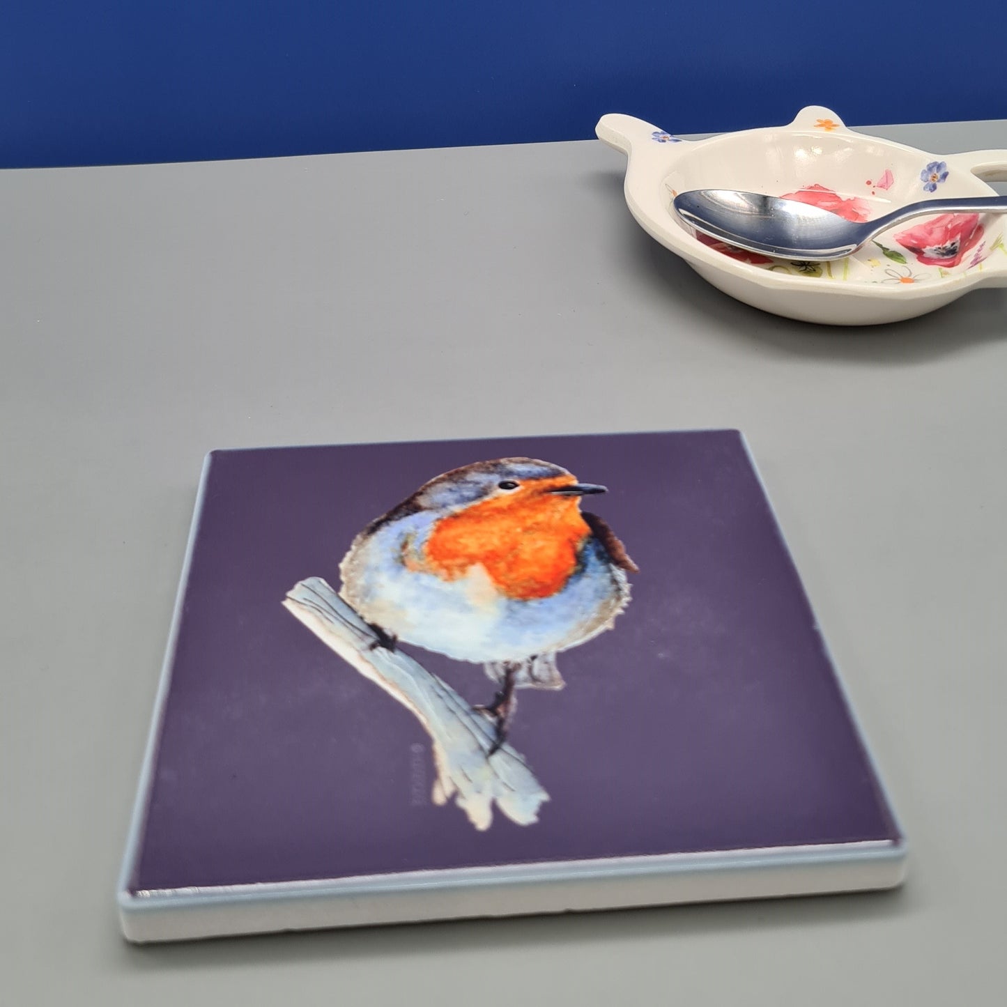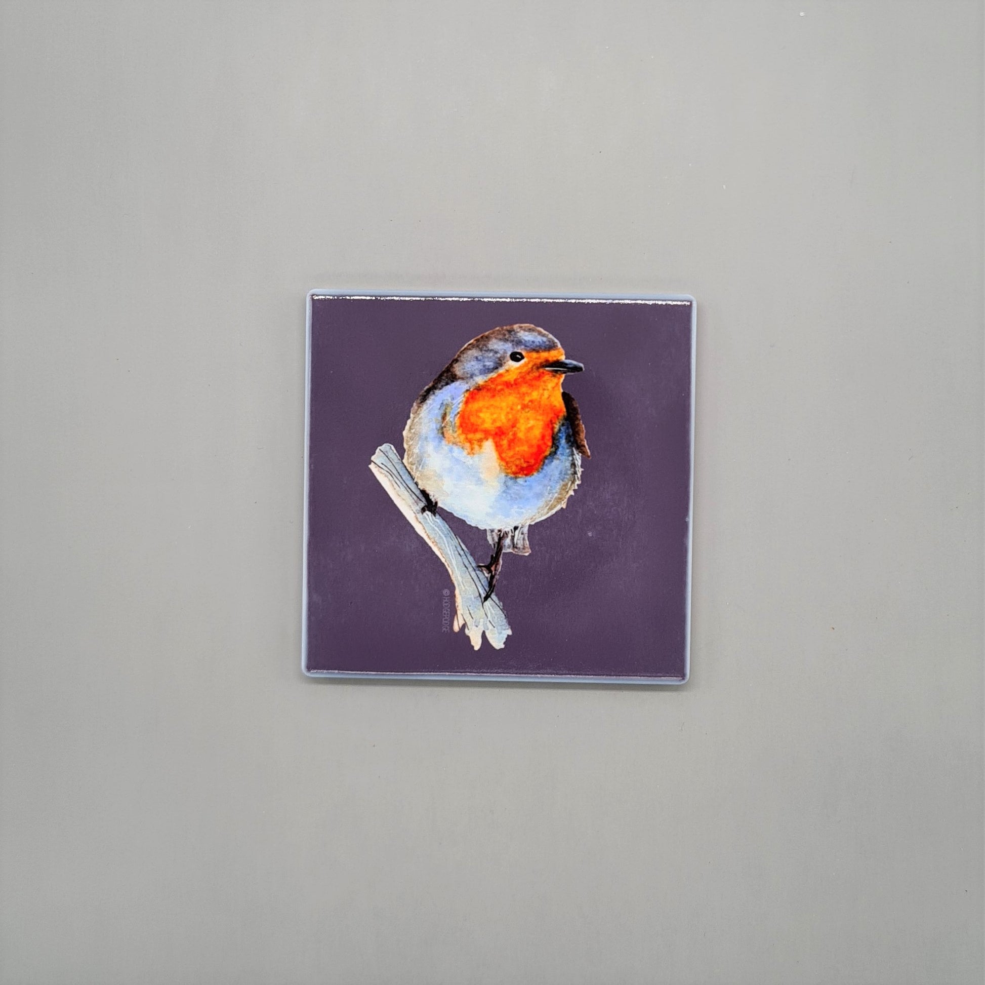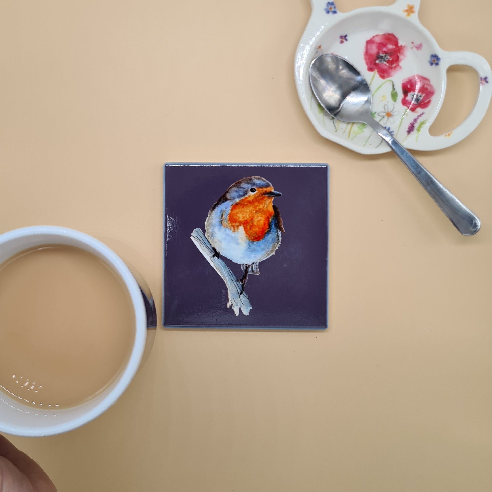 A beautifully illustrated British Robin Ceramic coaster featuring a print of my original watercolour painting Garden Party.
