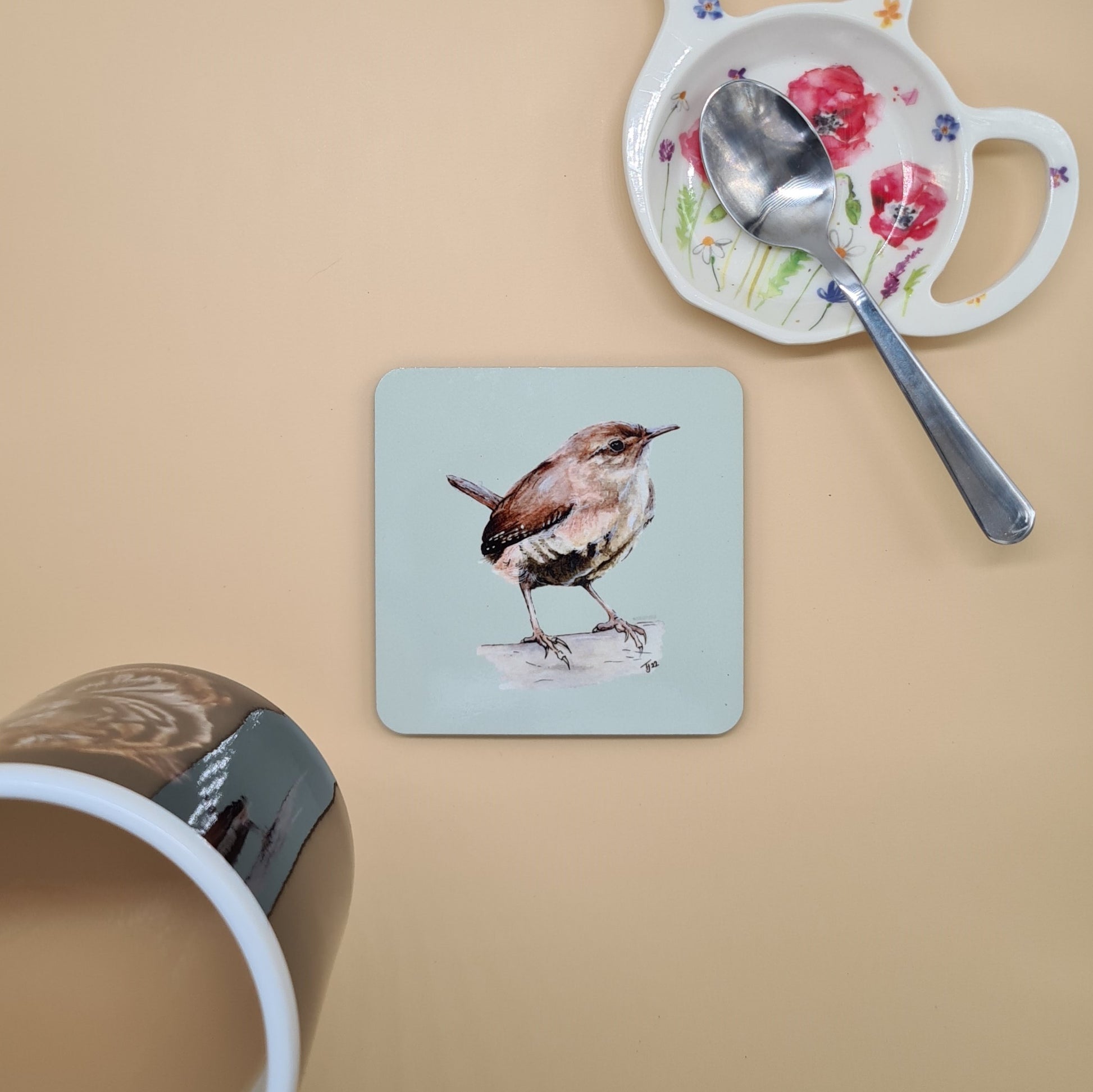 A beautifully illustrated British Wren Hardwood coaster featuring a print of my original watercolour painting Jenny Wren.