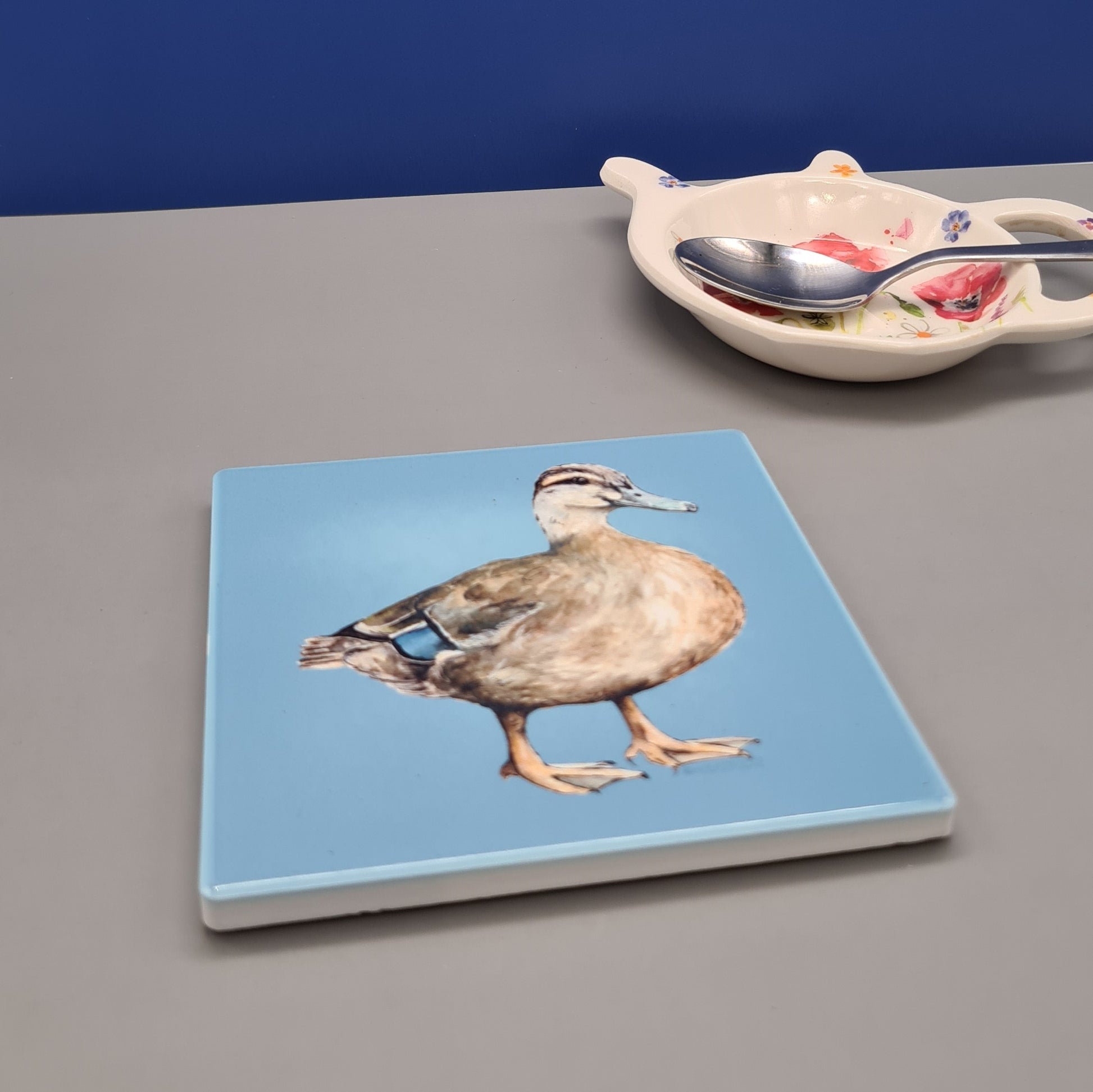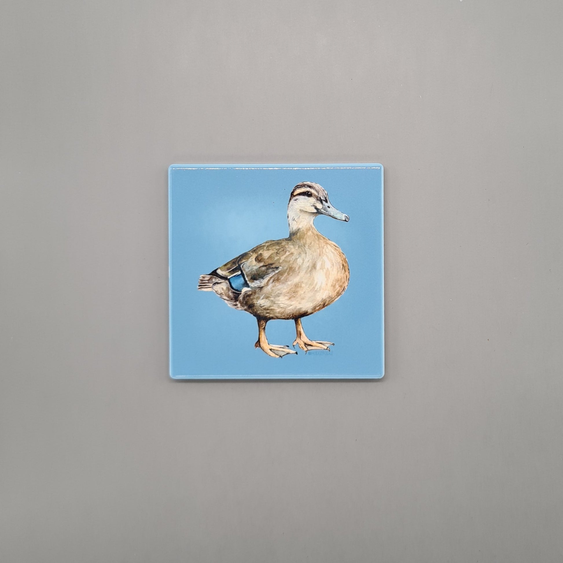 A beautifully illustrated female Mallard Duck ceramic coaster featuring a print of my original watercolour painting Queenie.