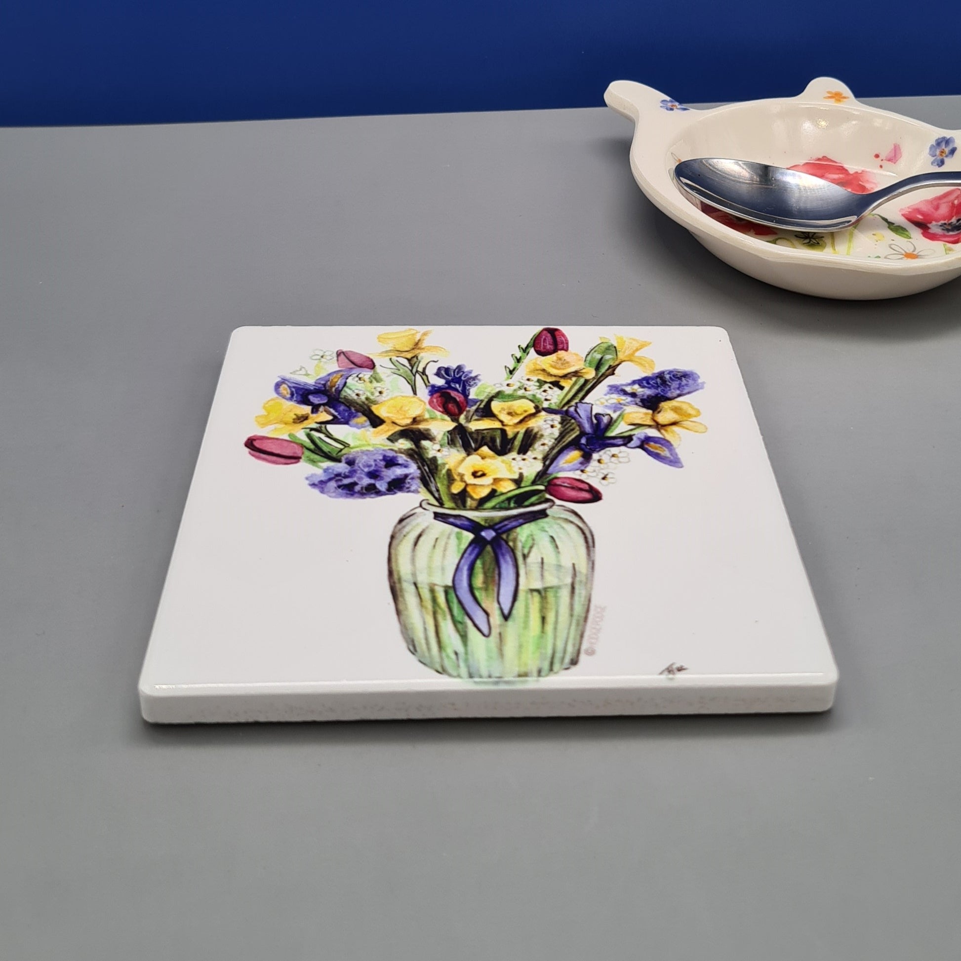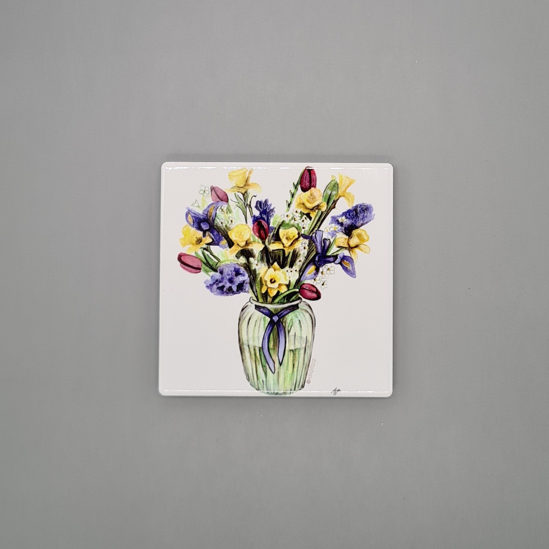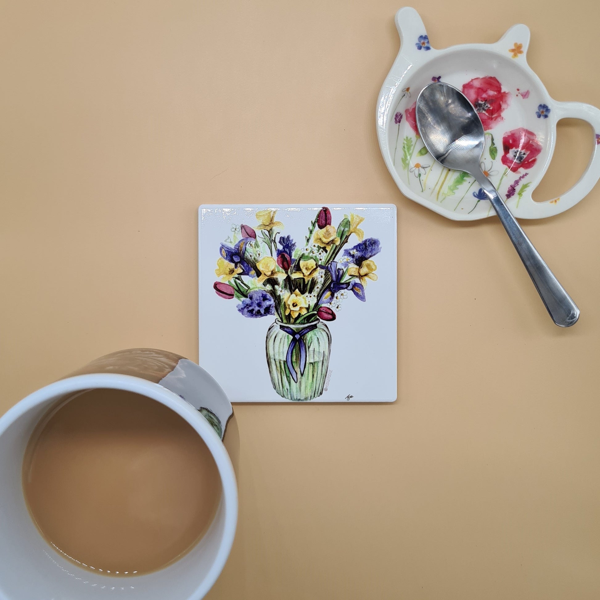 A beautifully illustrated Vase of Flowers Ceramic coaster featuring a print of my original watercolour painting A Bunch of Spring.