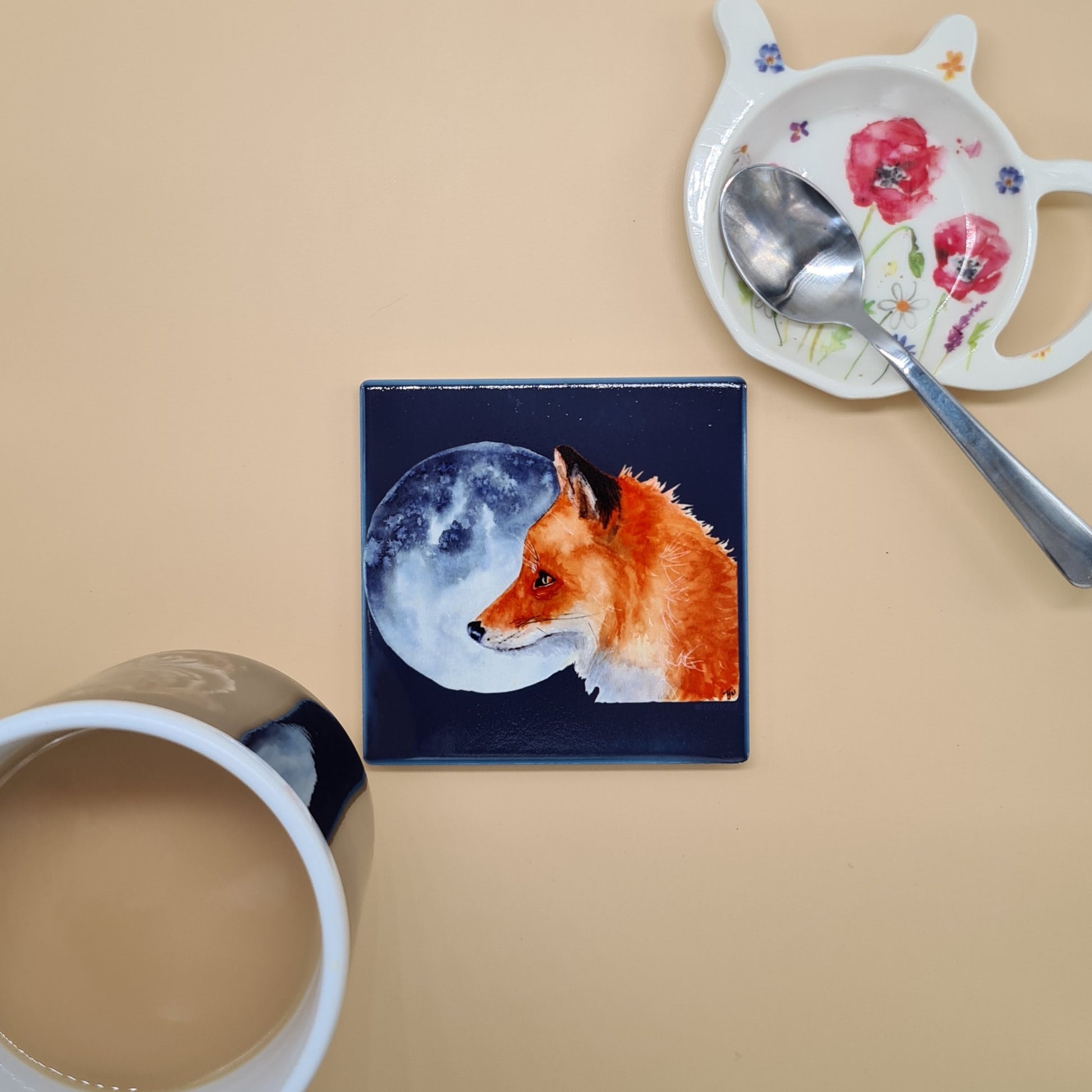 A beautifully illustrated Fox & Moon ceramic coaster featuring a print of my original watercolour painting Luna.