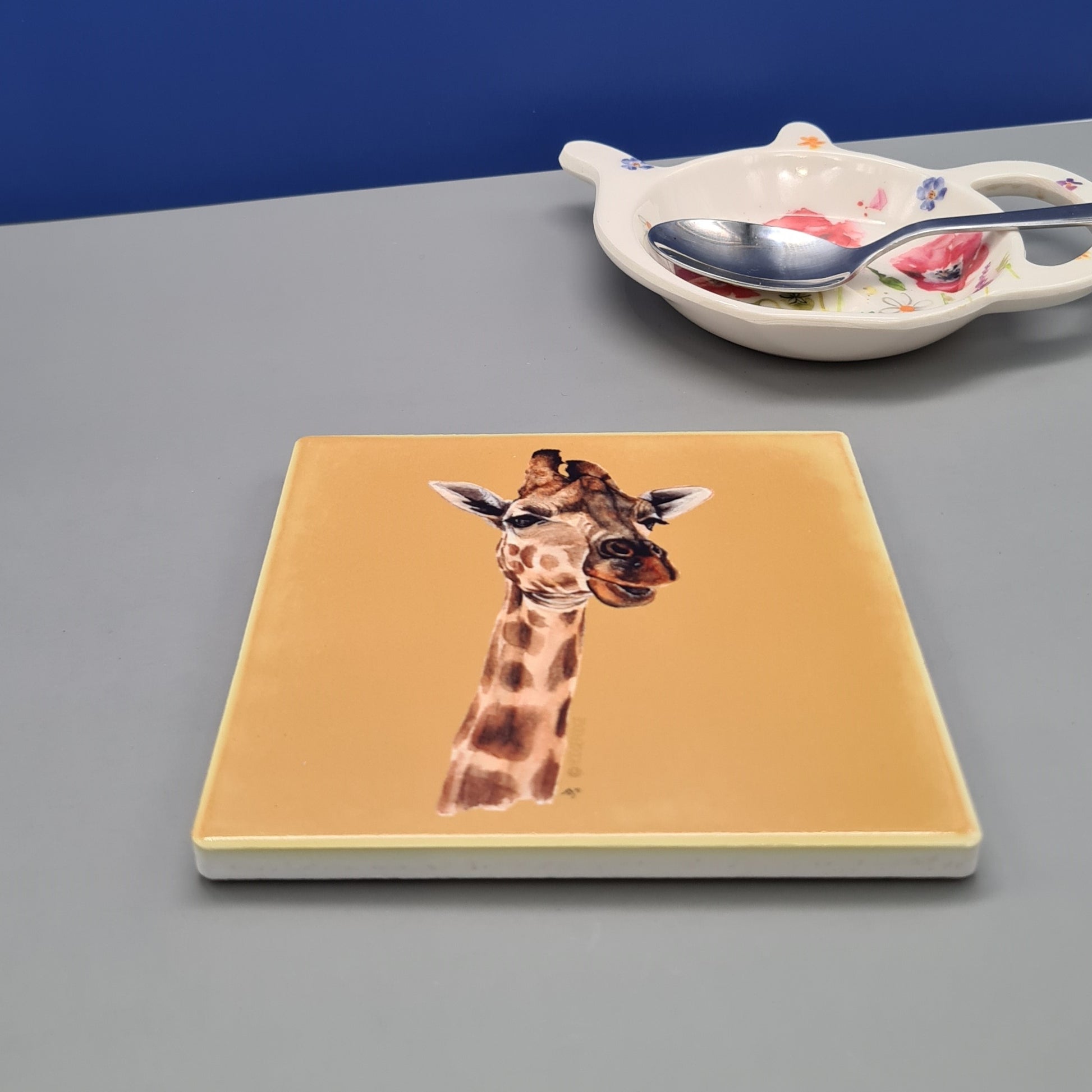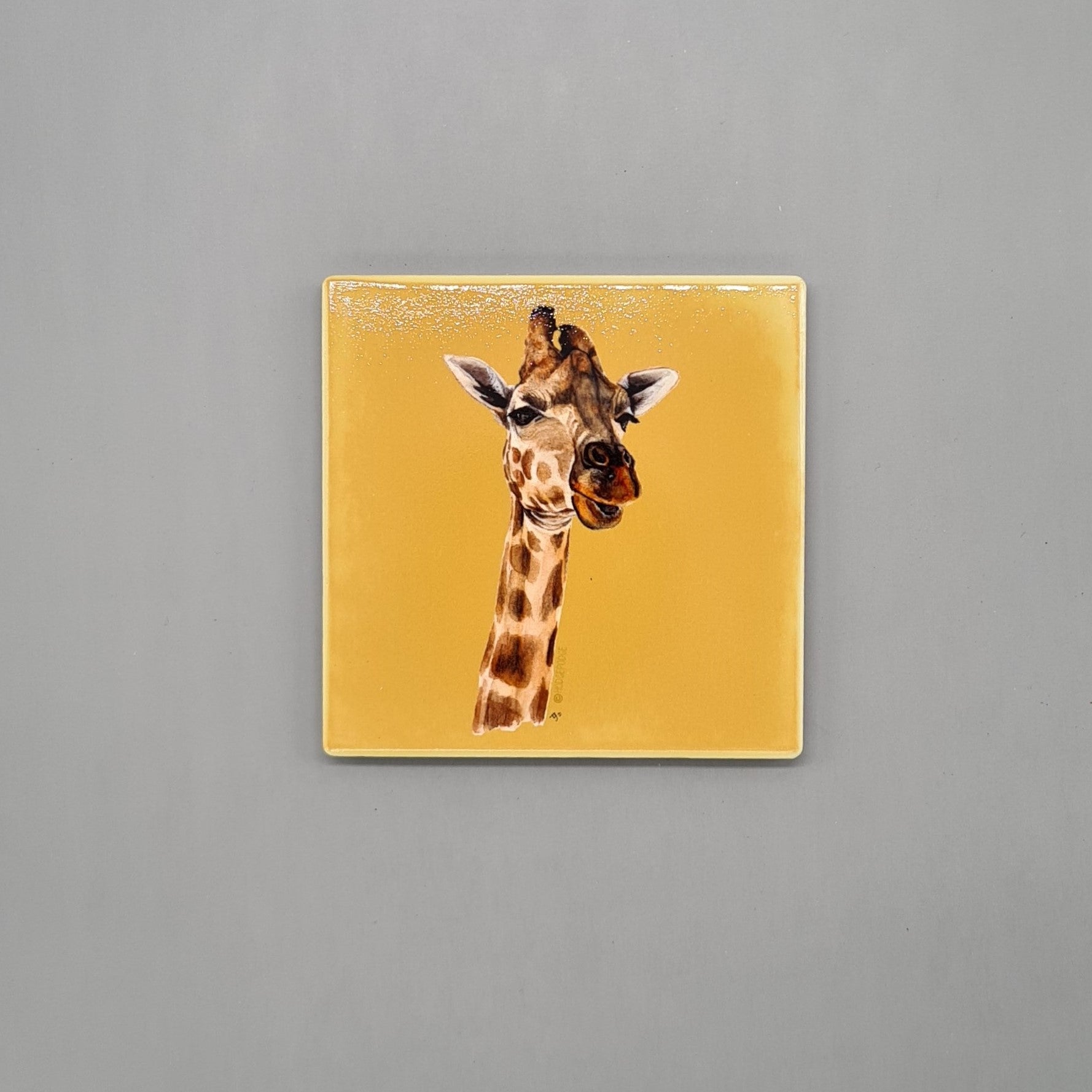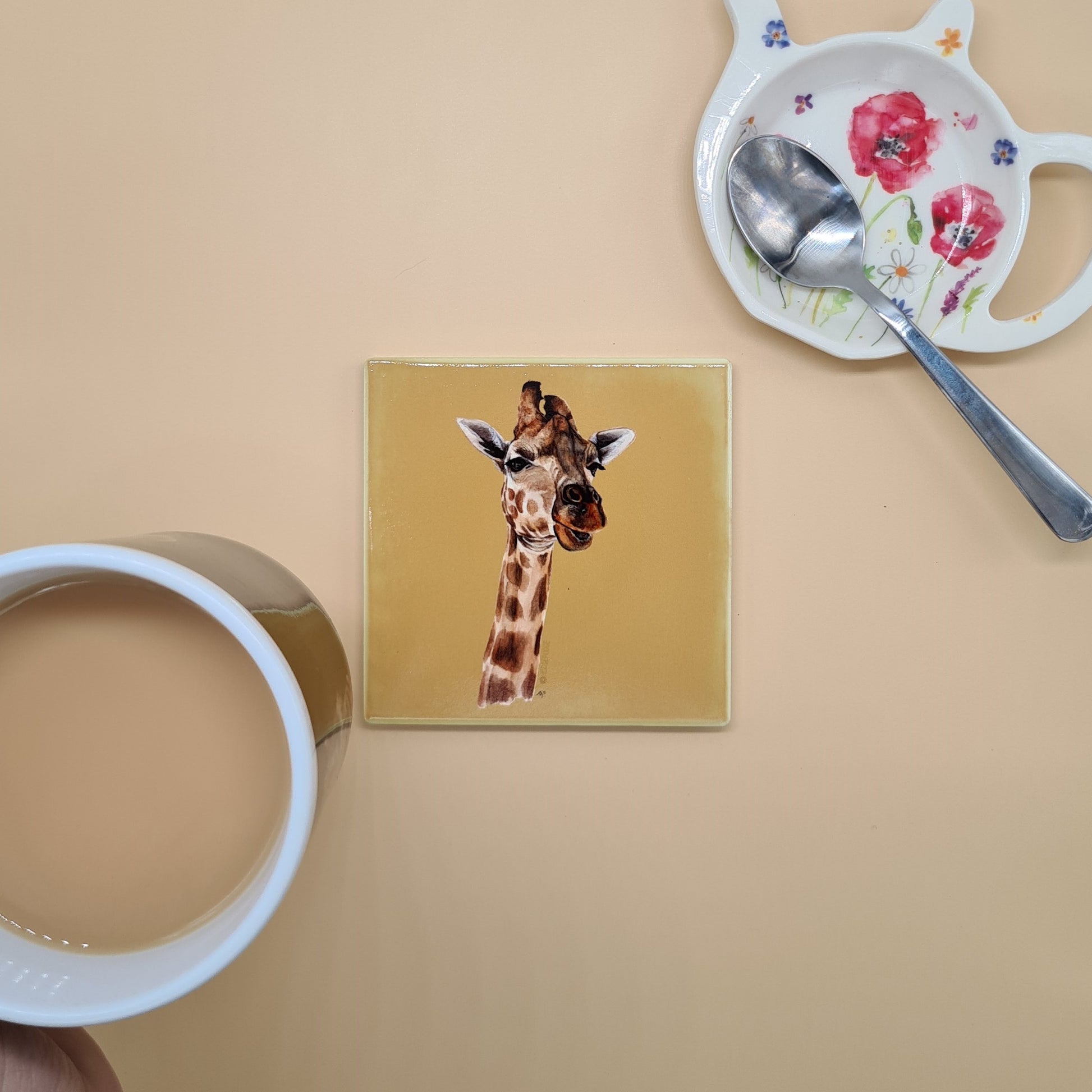 A beautifully illustrated giraffe Ceramic coaster featuring a print of my original watercolour painting Stand Tall.