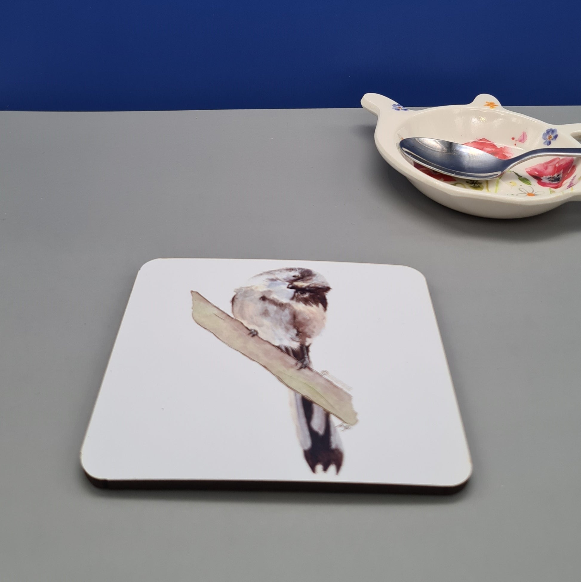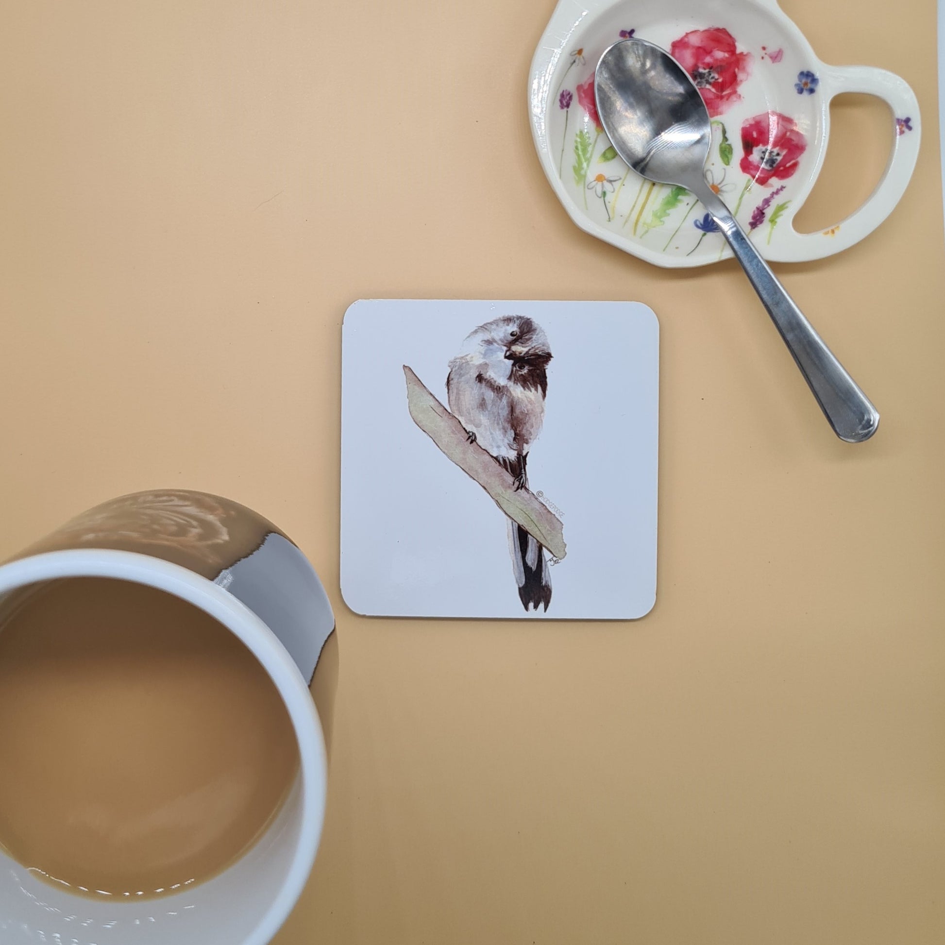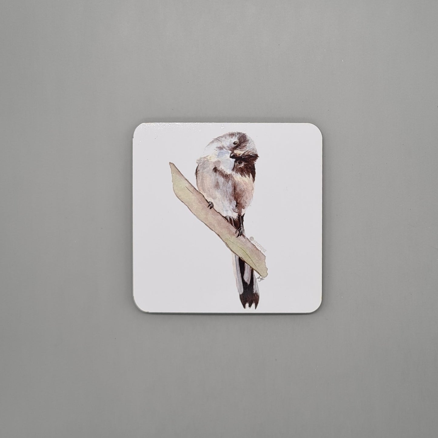 A beautifully illustrated British Long Tailed Tit hardboard coaster featuring a print of my original watercolour painting Whats This?.