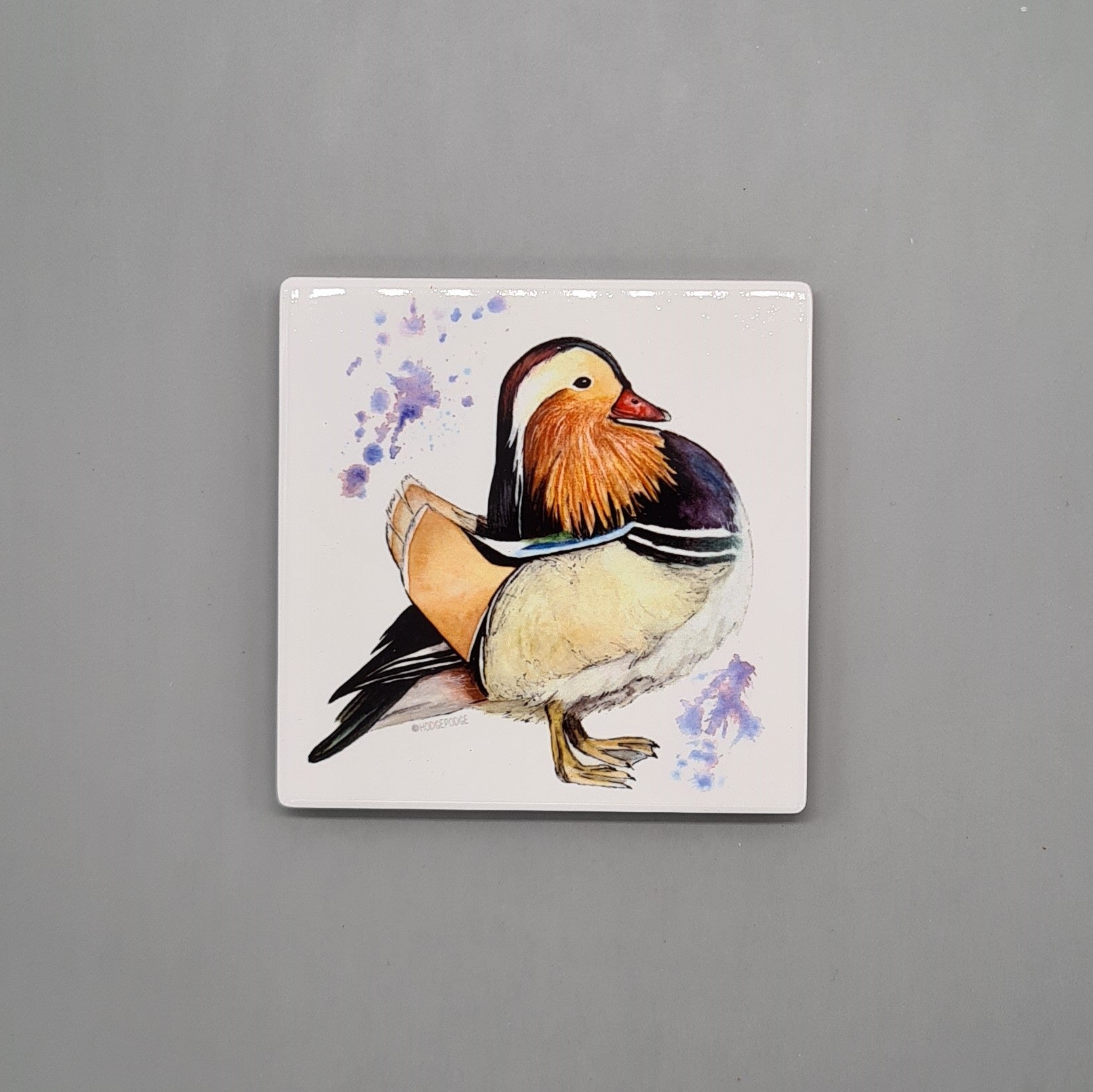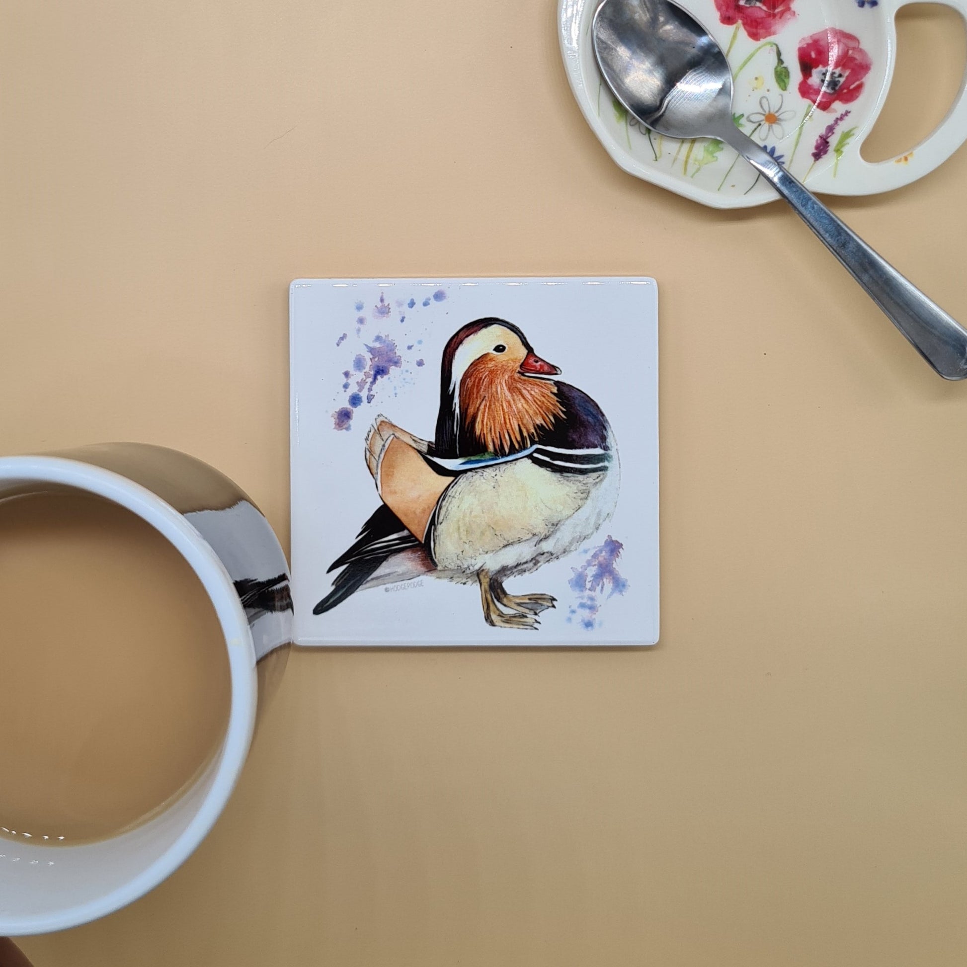 A beautifully illustrated Mandarin Duck Ceramic coaster featuring a print of my original watercolour painting Fancyboi.