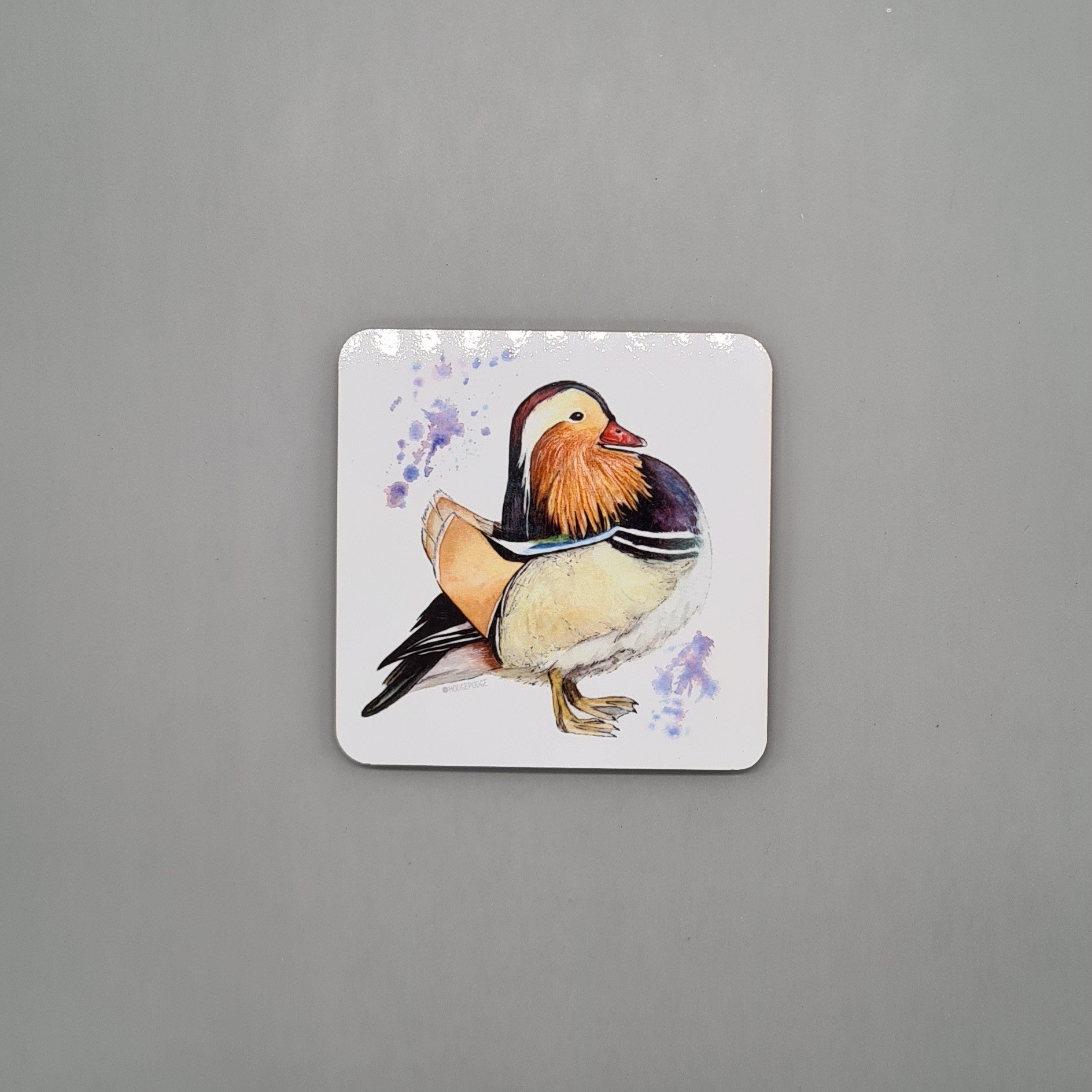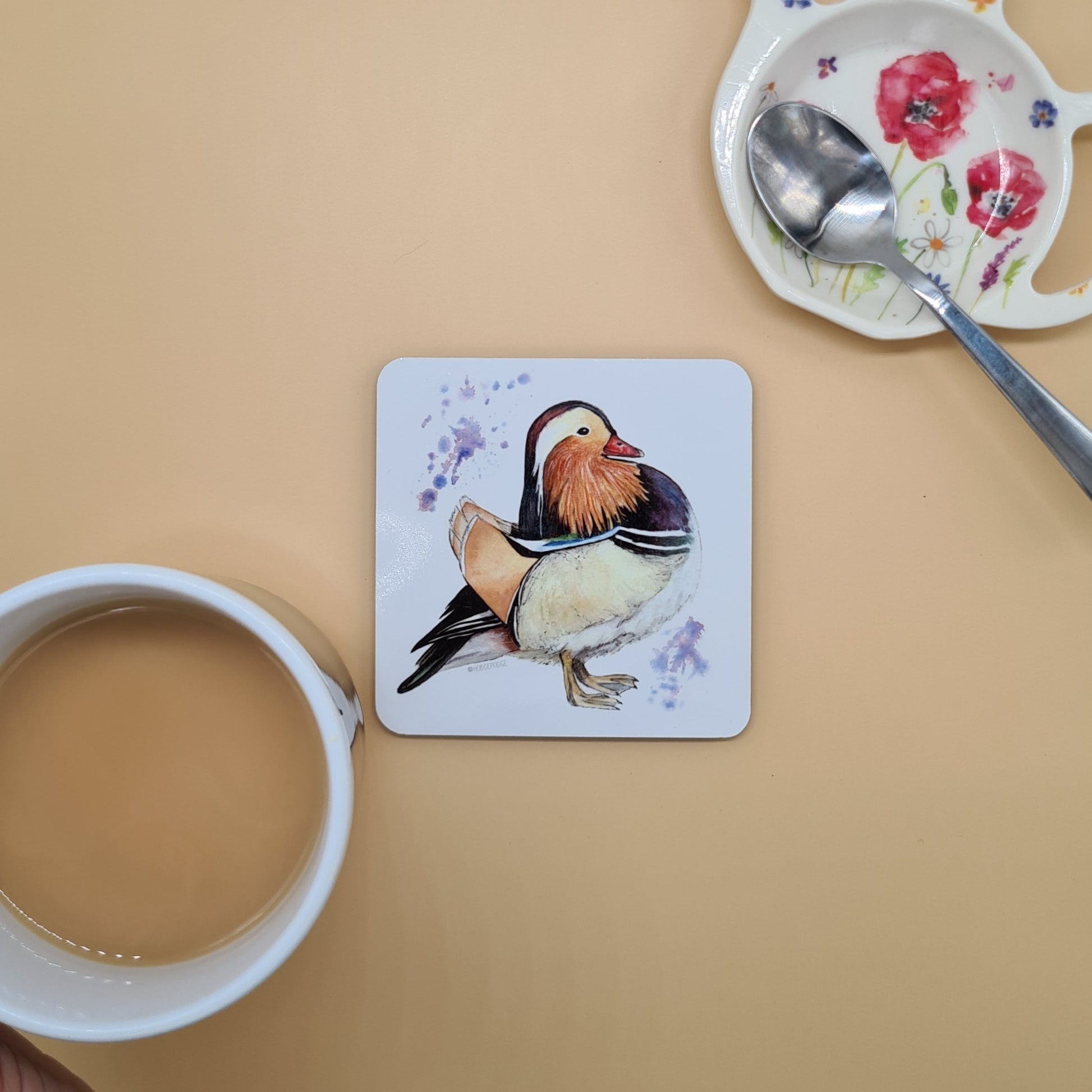 A beautifully illustrated Mandarin Duck Ceramic coaster featuring a print of my original watercolour painting Fancyboi.