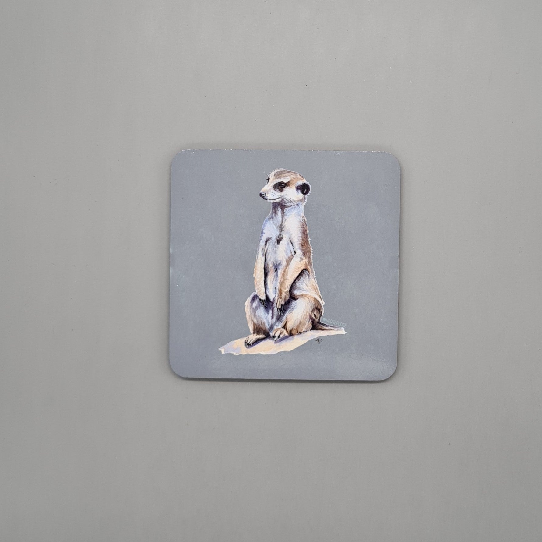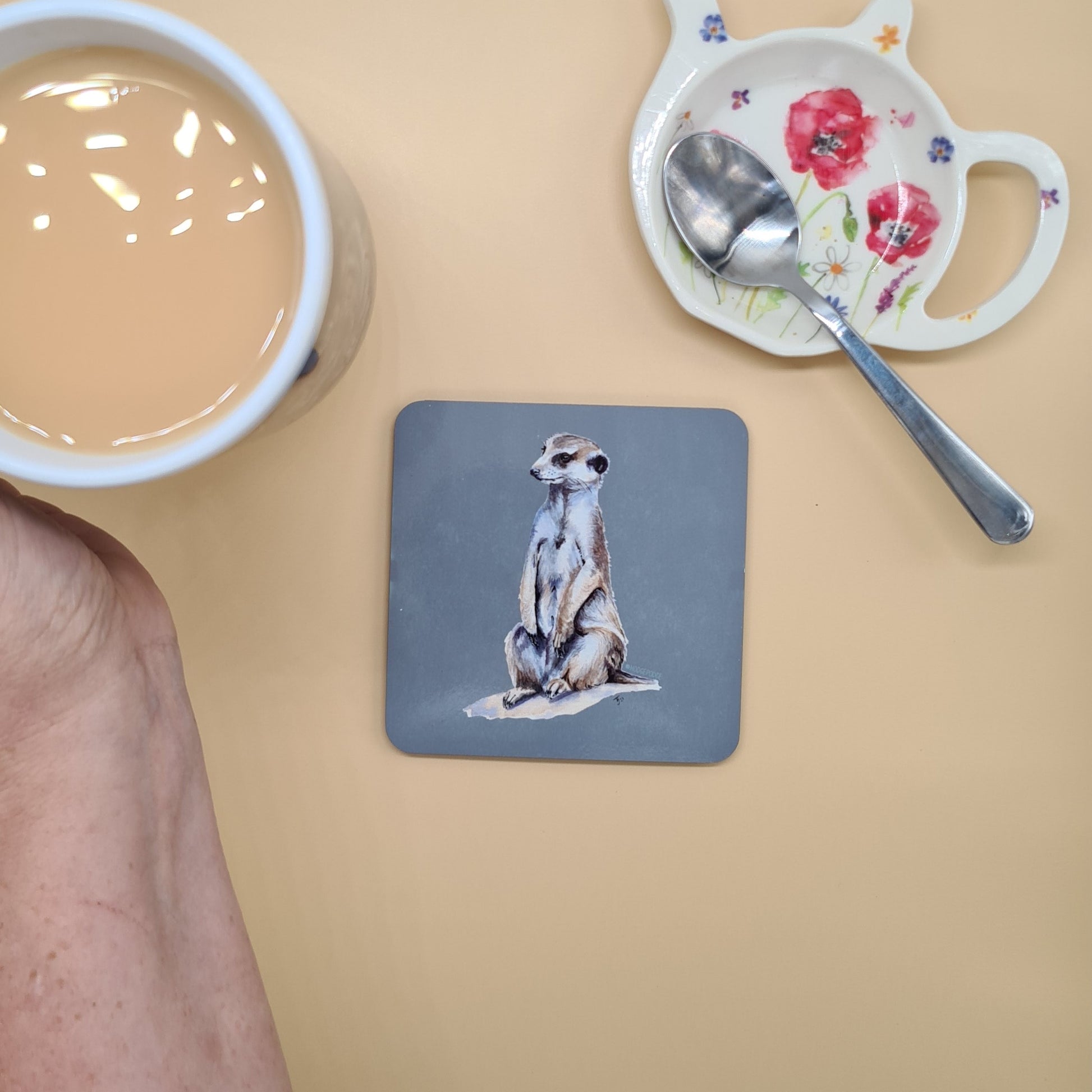 A beautifully illustrated meerkat ceramic coaster featuring a print of my original watercolour painting Ubunifu.