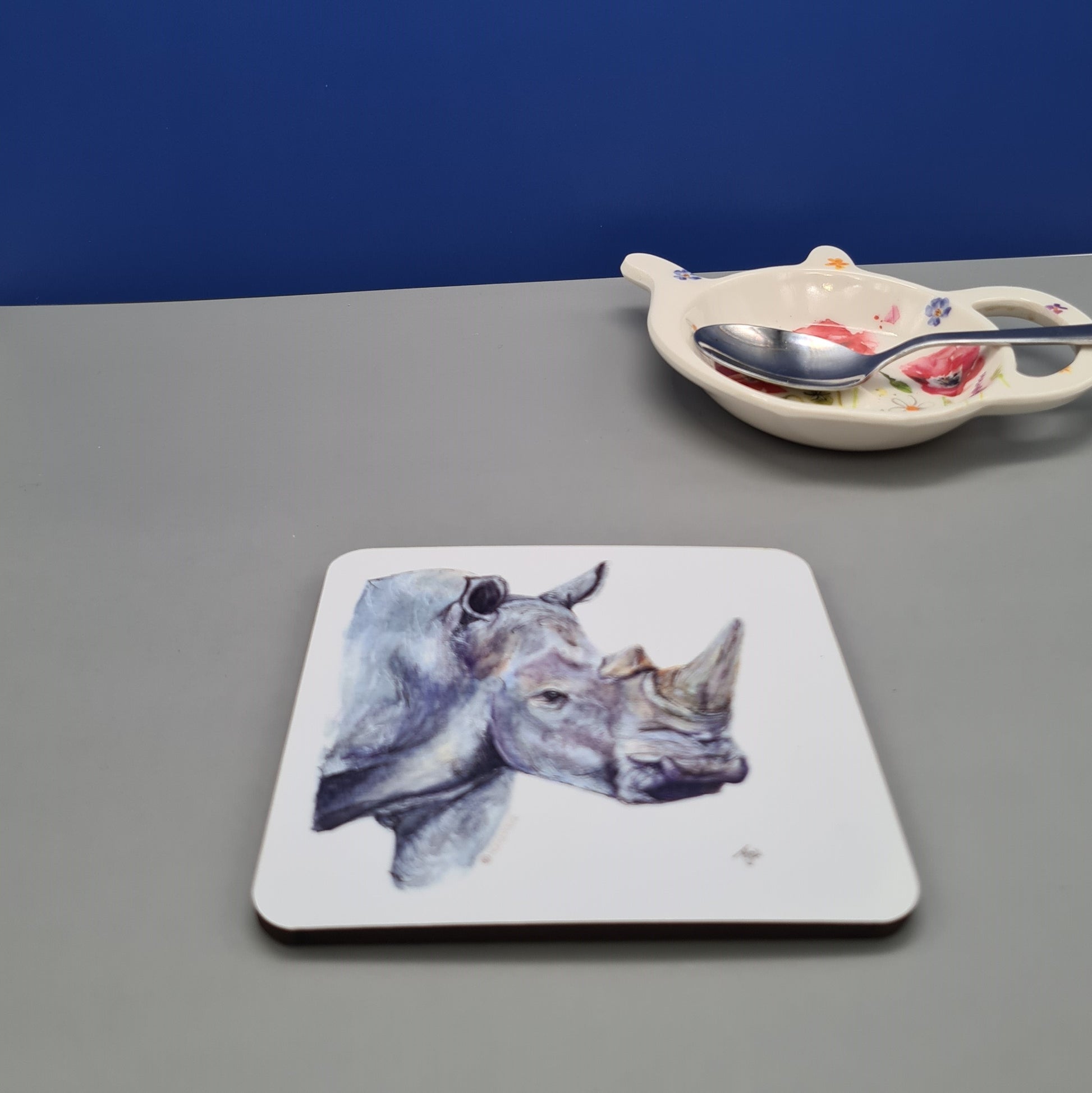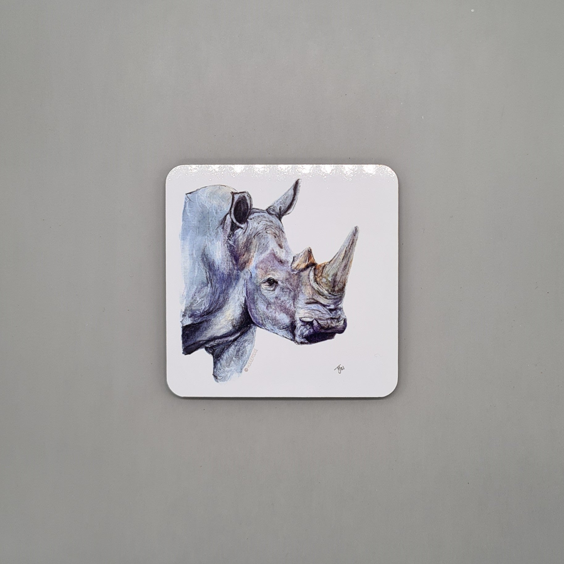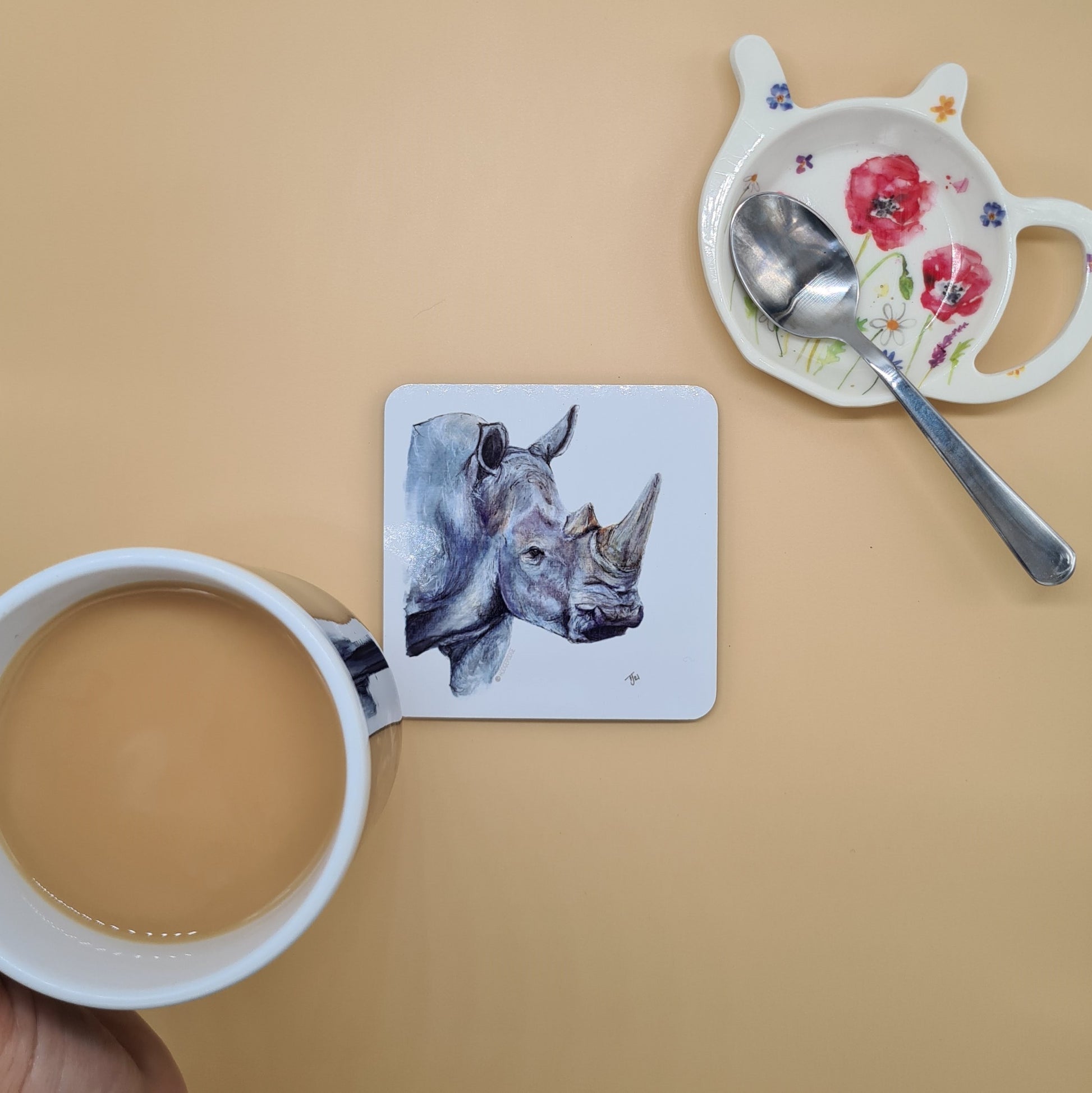 A beautifully illustrated Rhino hardboard coaster featuring a print of my original watercolour painting Yenye Unguvu.