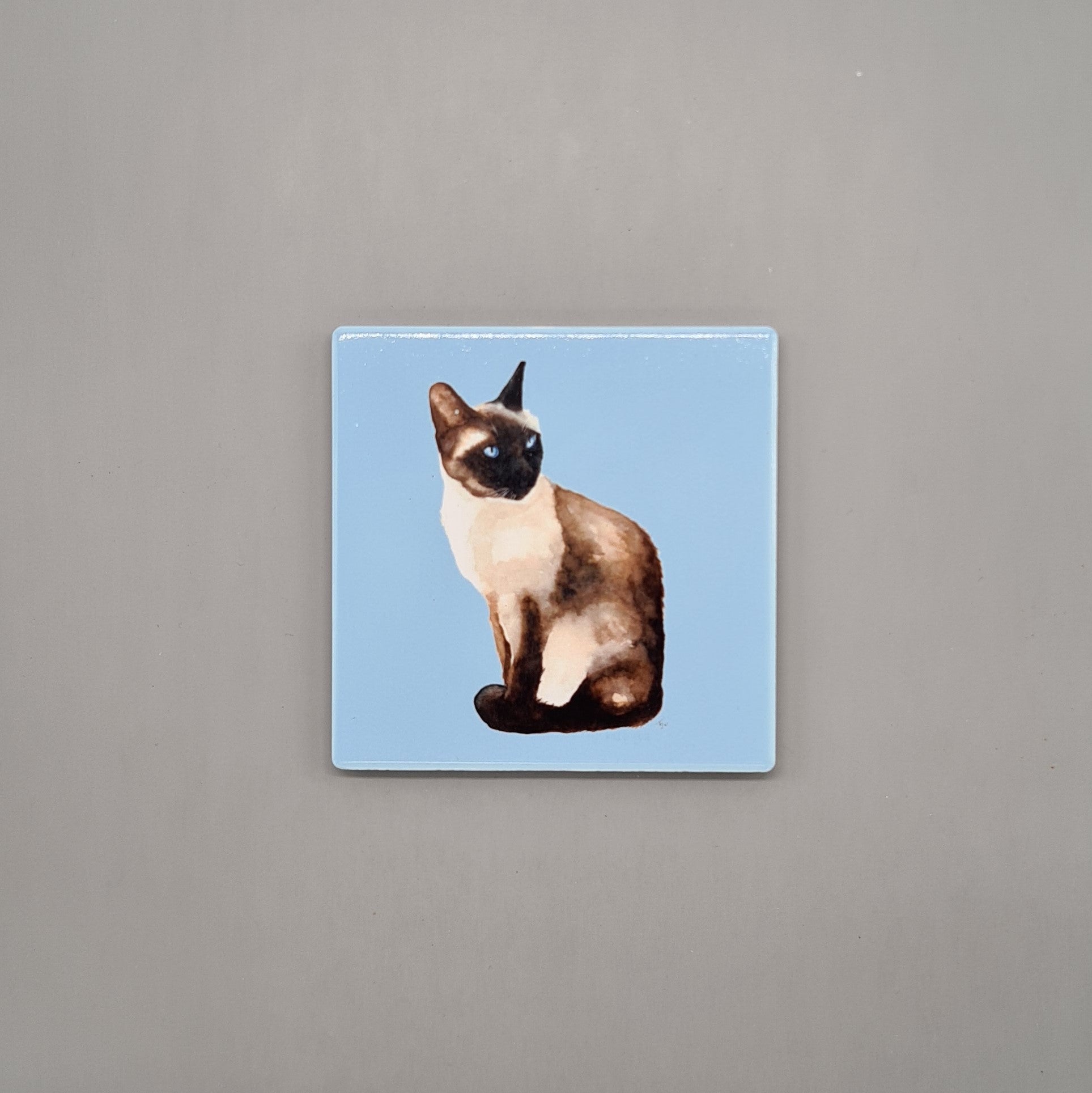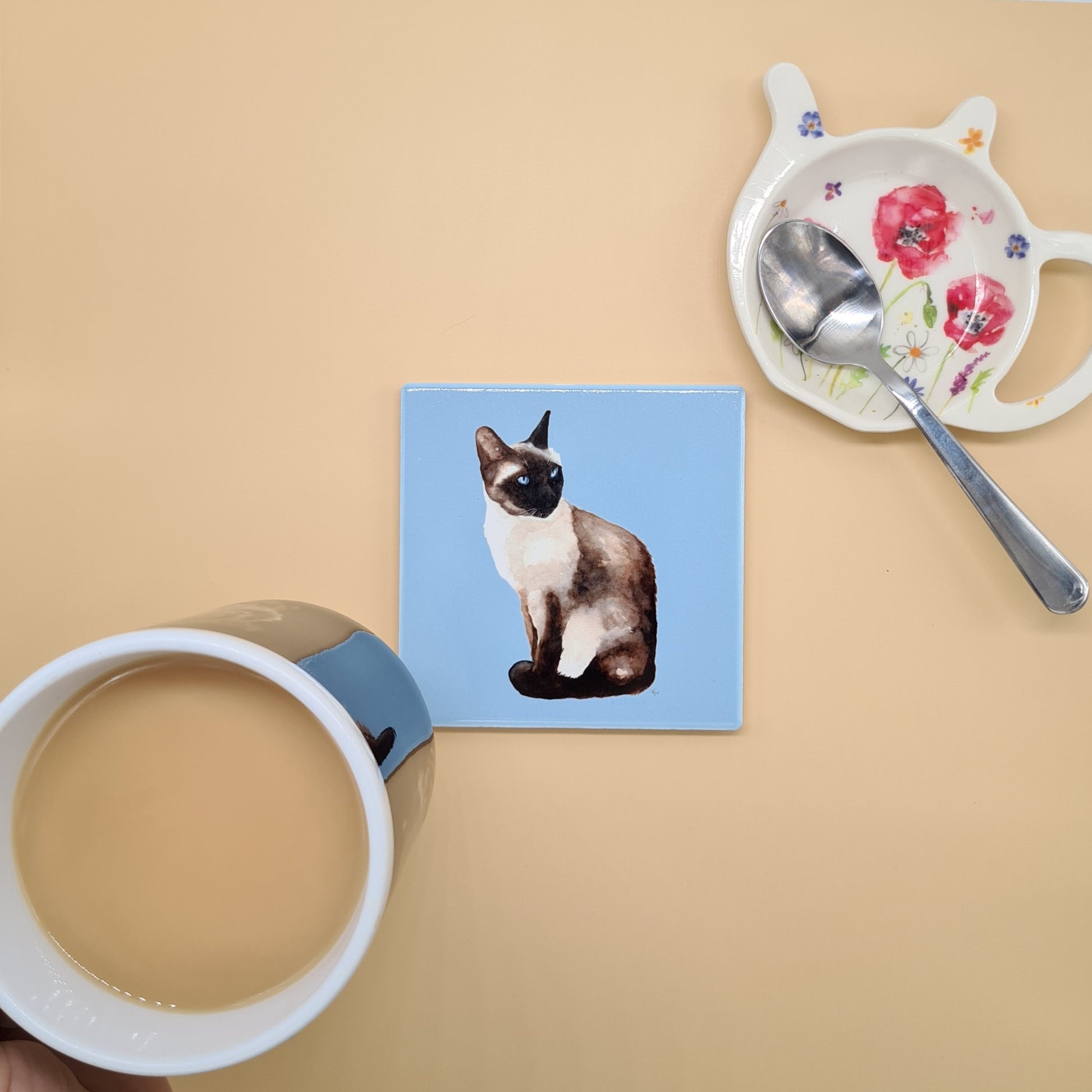 A beautifully illustrated Siamese Cat Ceramic coaster featuring a print of my original watercolour painting, If you please.