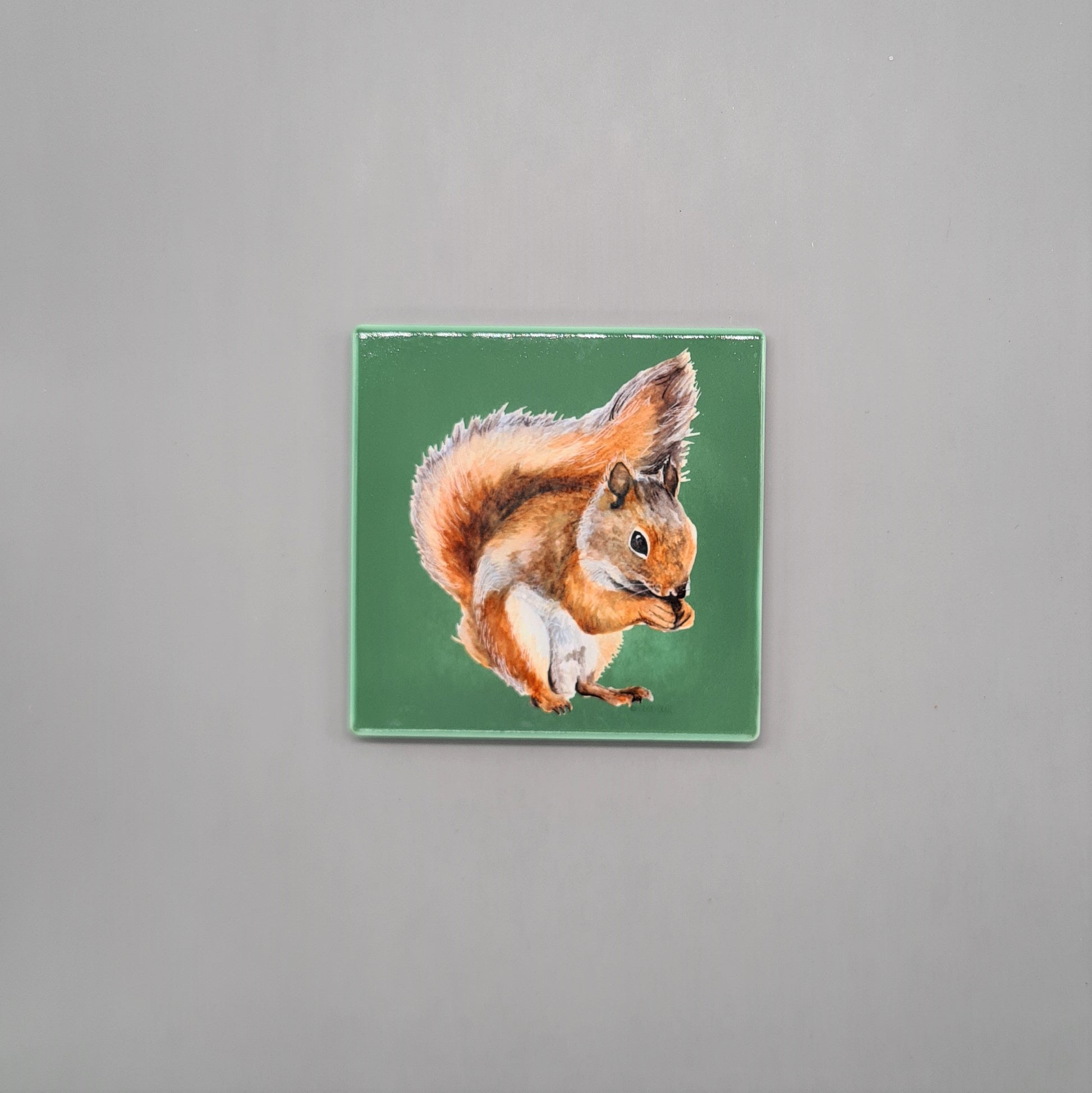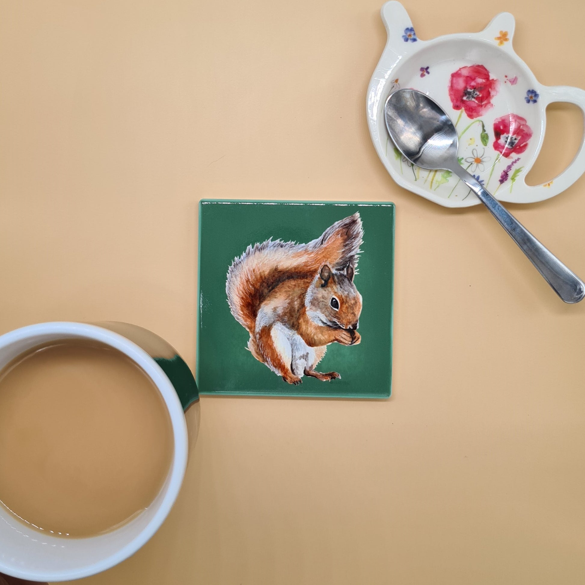 A beautifully illustrated Red Squirrel ceramic coaster featuring a print of my original watercolour painting Nutkin.