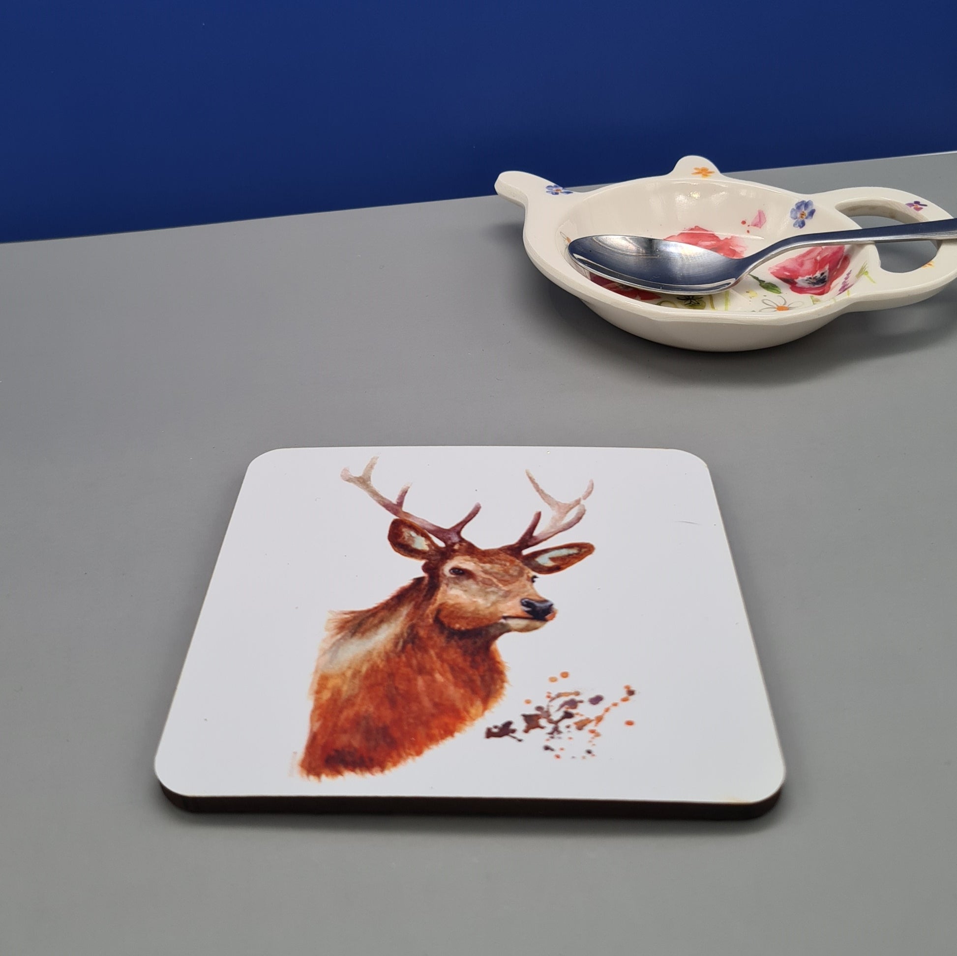 A beautifully illustrated Stag hardboard coaster featuring a print of my original watercolour painting Chase.