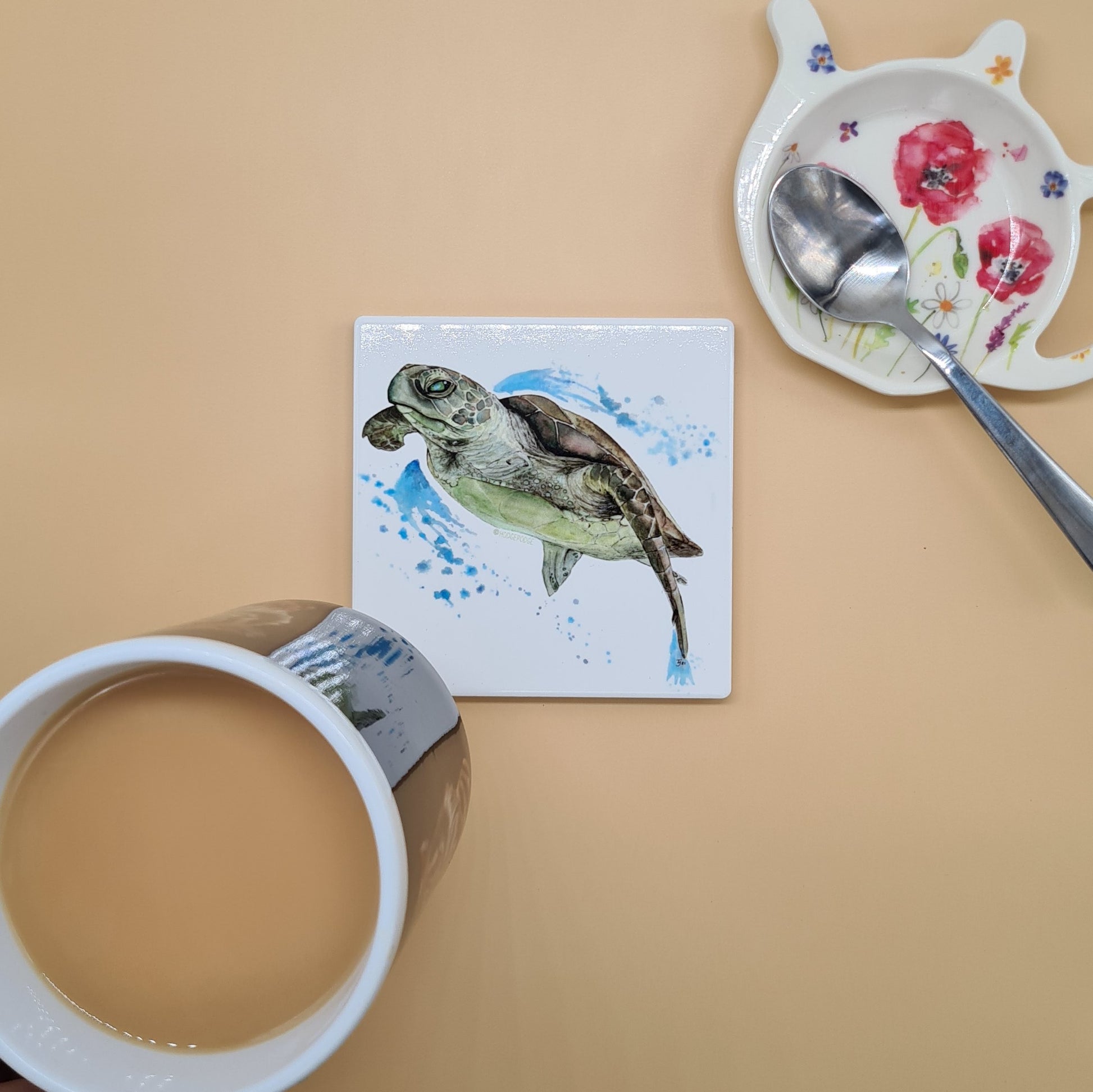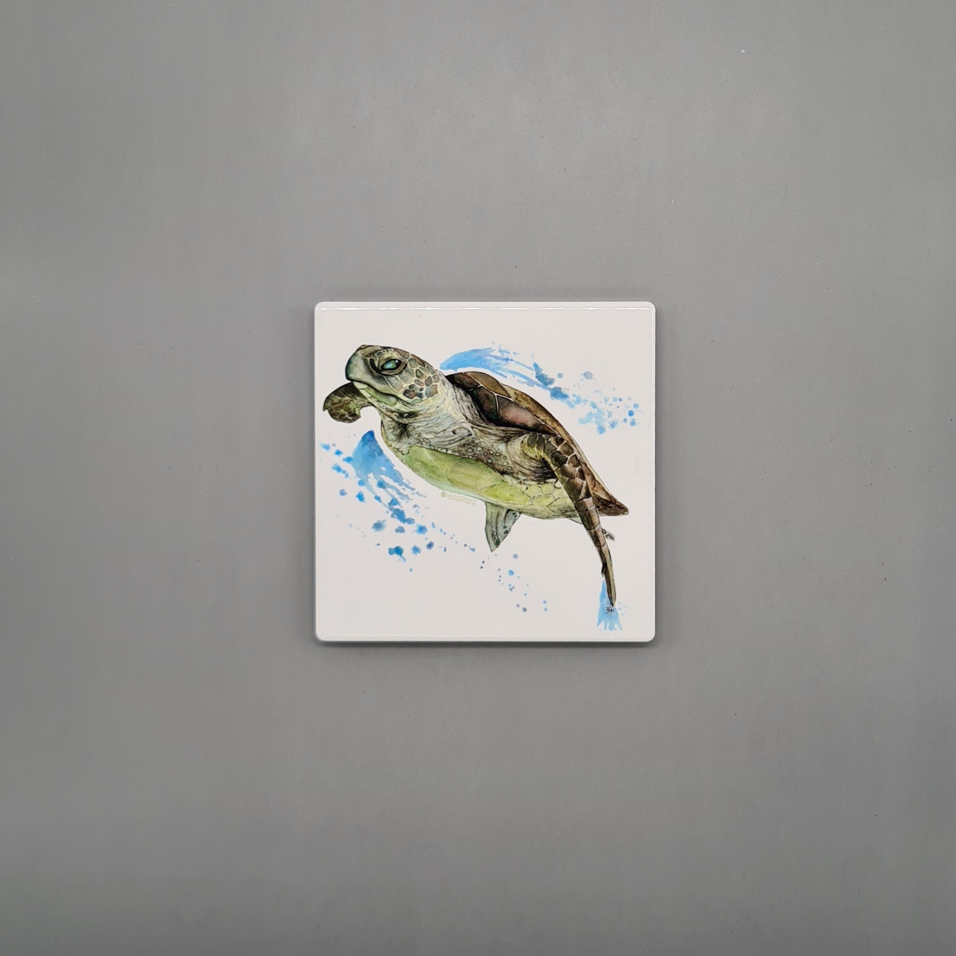 Beautiful Turtle Art Ceramic Coaster featuring 'Mabouche' Print