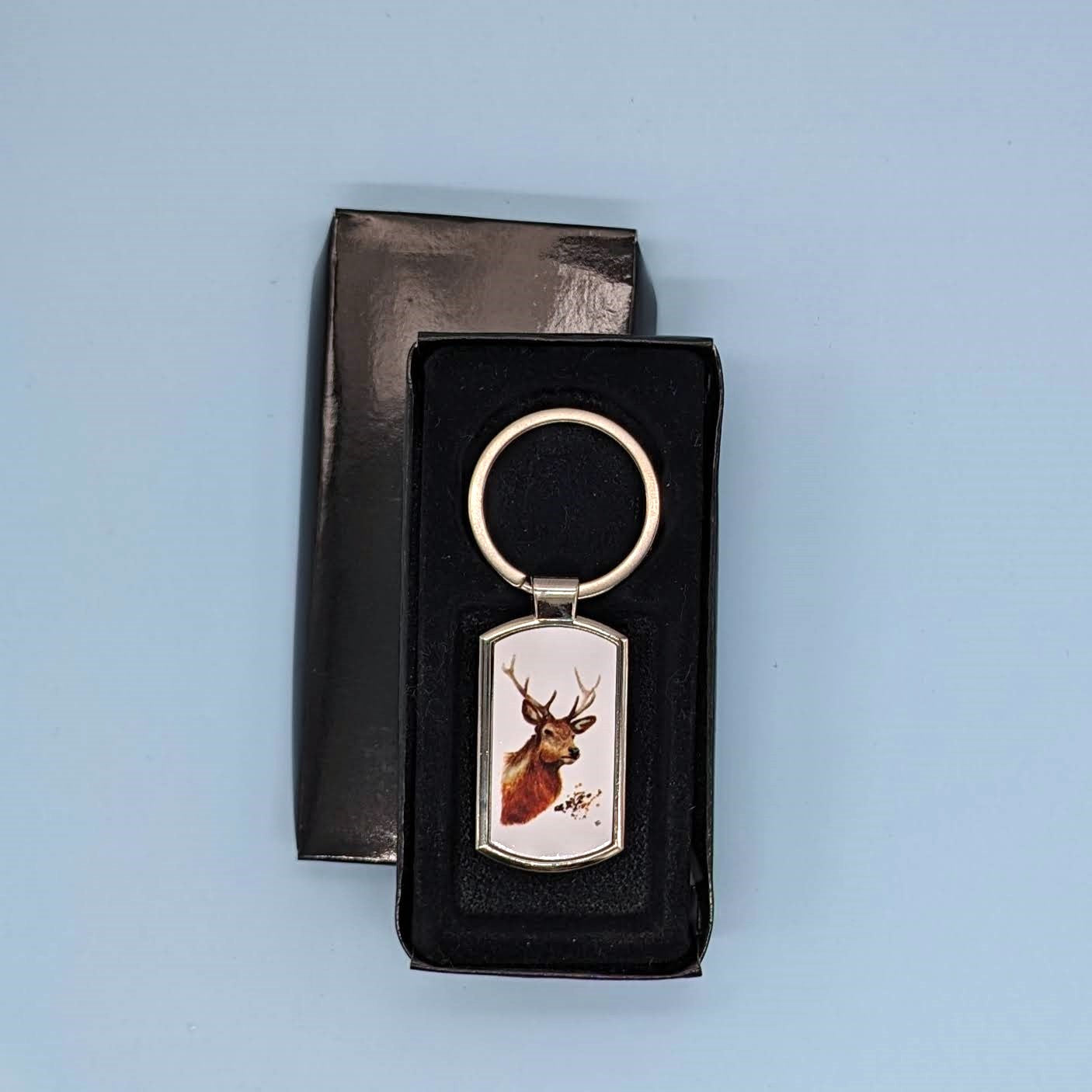A stunning tag shaped Stag keyring featuring a print of the original watercolour "Chase" by Tara Pryor.