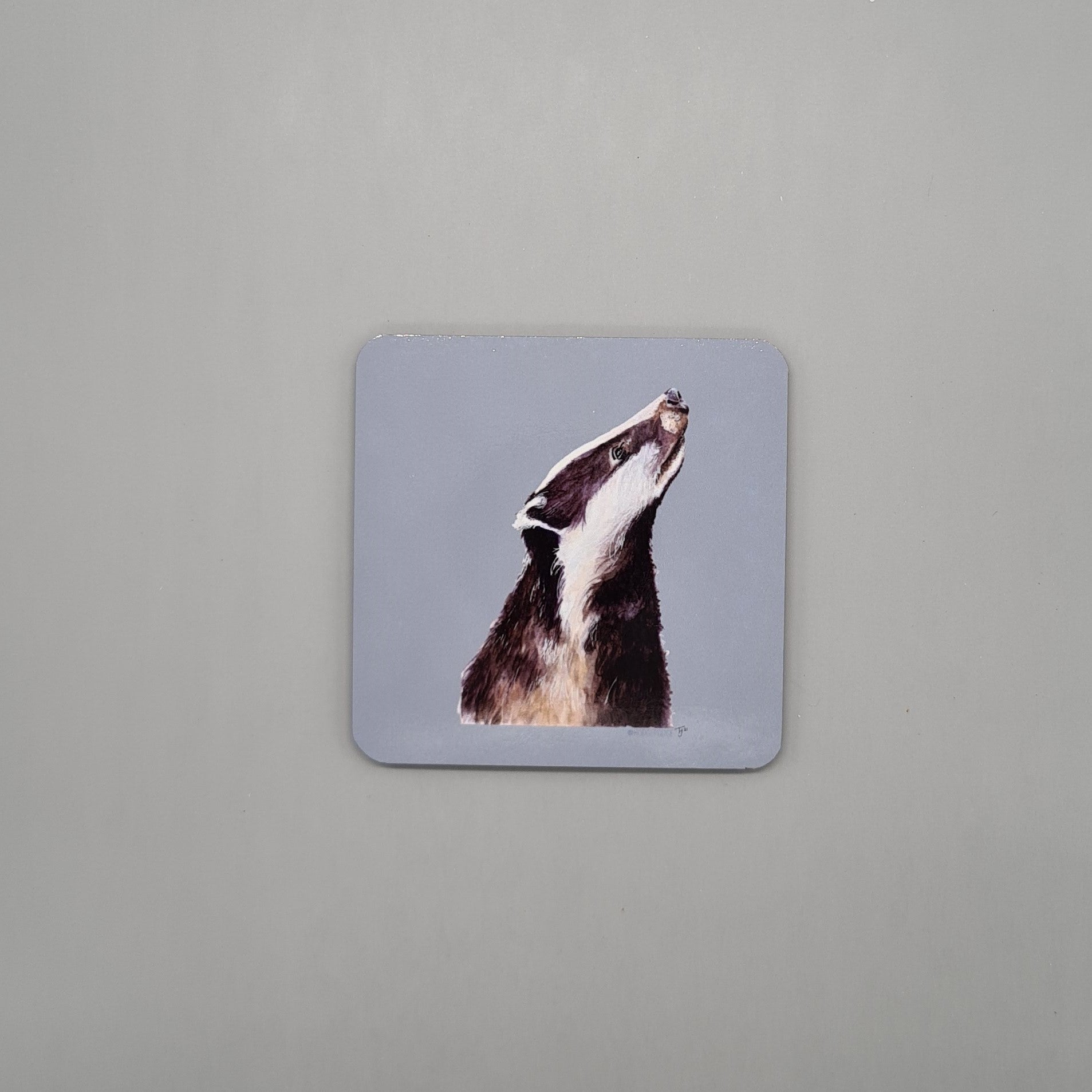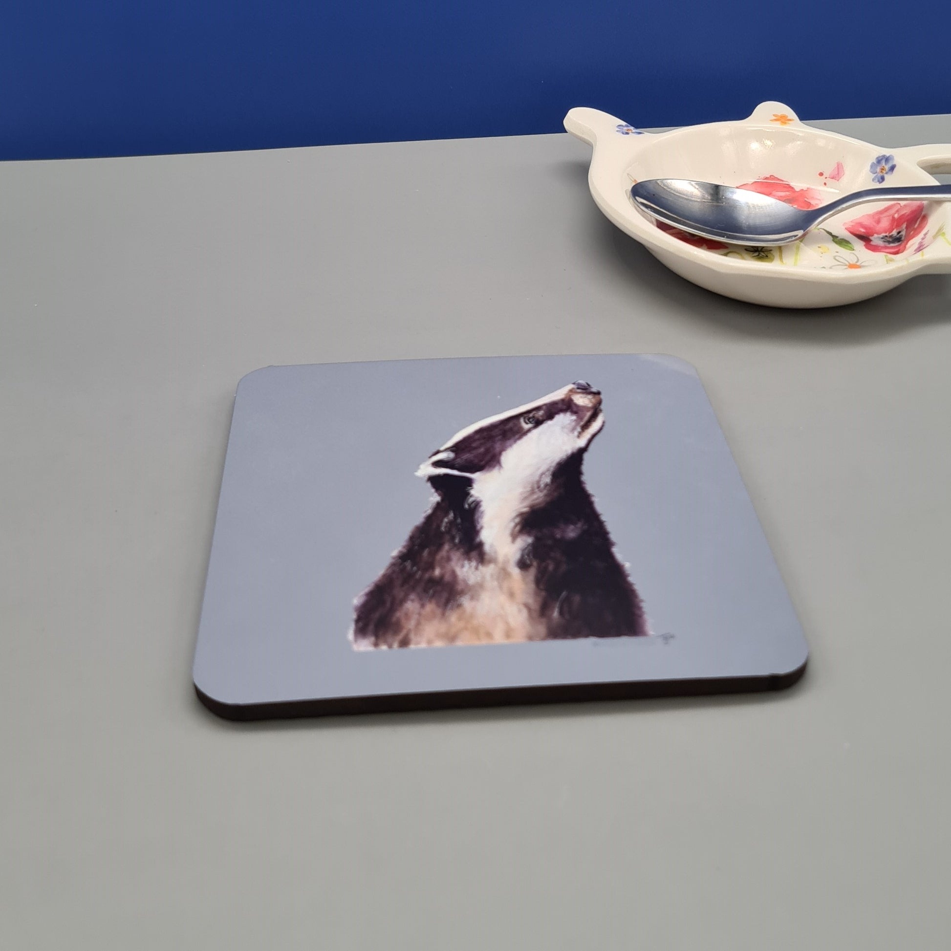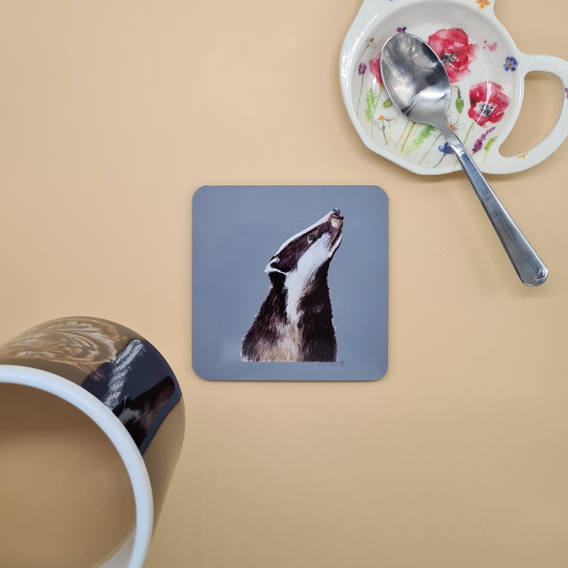 A beautifully illustrated Badger hardboard coaster featuring a print of my original watercolour painting Mr Badger.