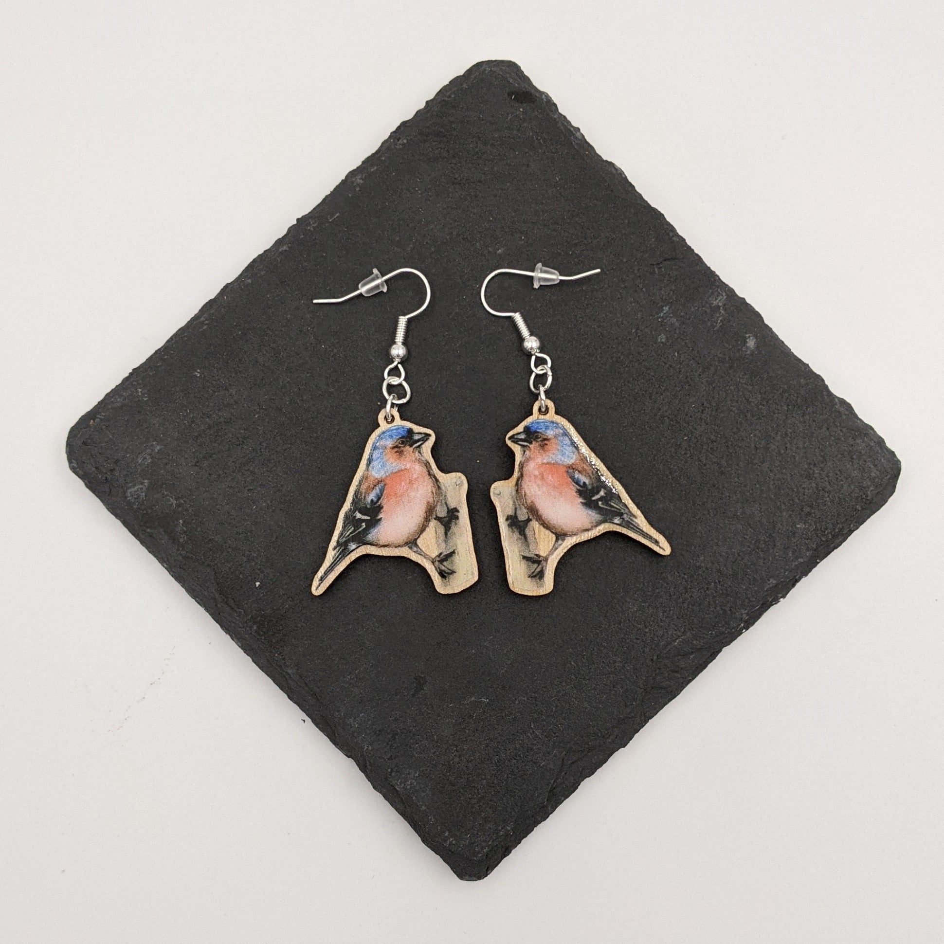 Each set of earrings is made using silver plated fish hook earring backs, with UV printed Chaffinches hanging down on sustainably sourced birch ply finished in a high sheen.