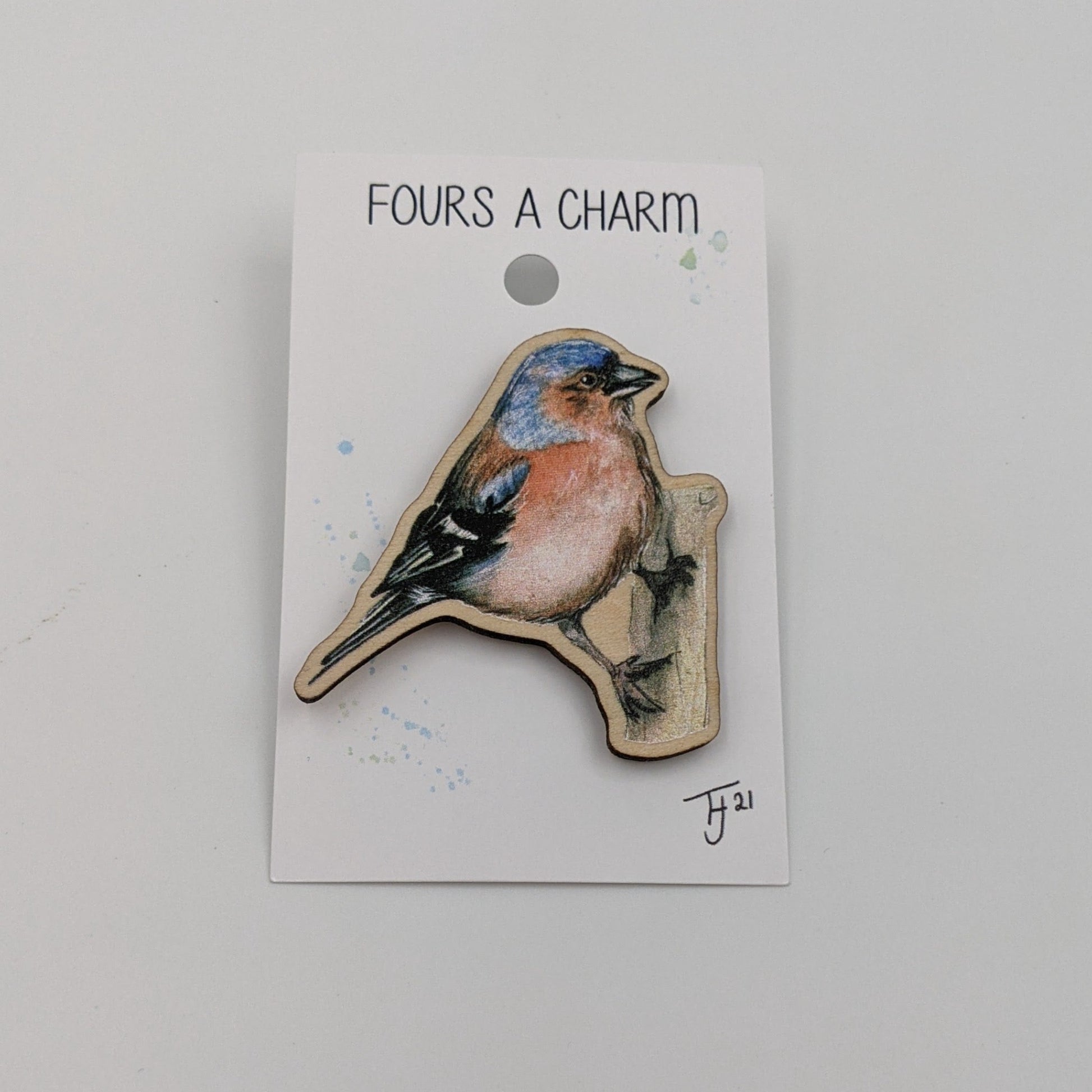 A wooden magnet featuring the Chaffinch from the ''Fours a Charm'' original Watercolour Art!