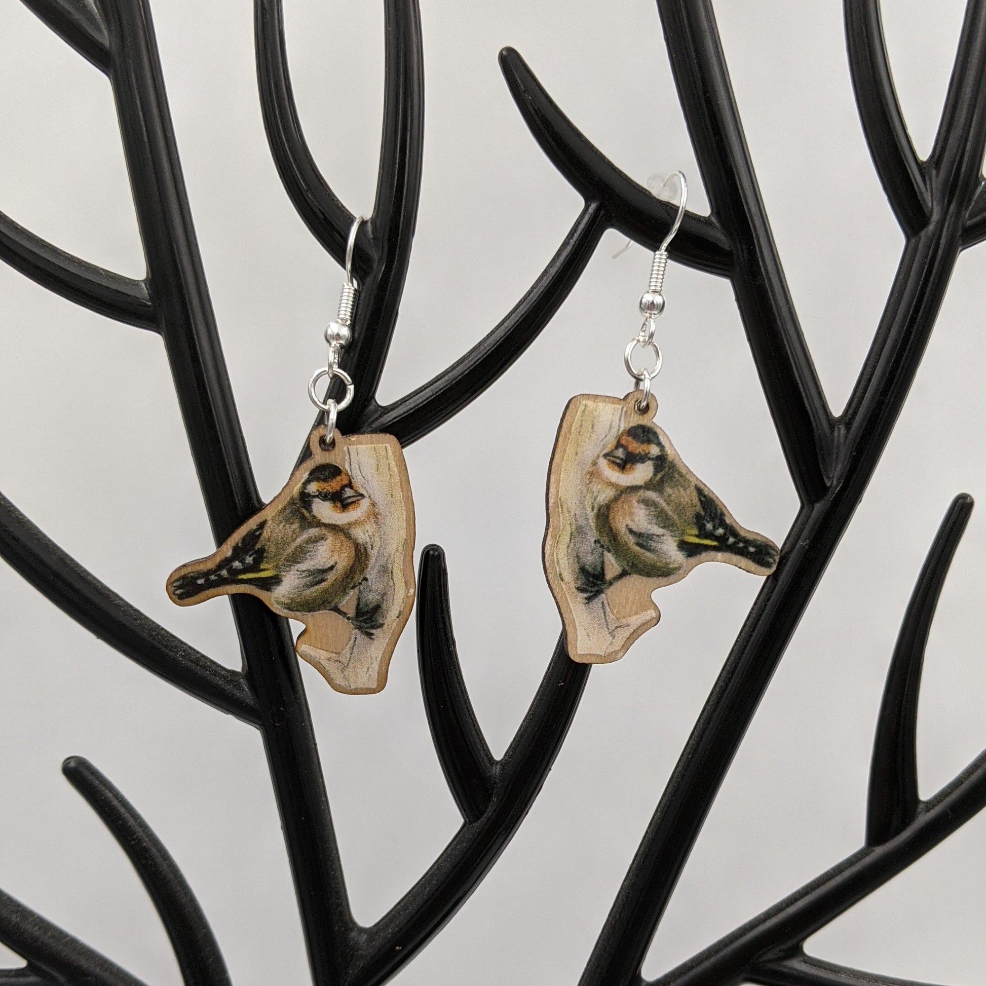 Each set of earrings is made using silver plated fish hook earring backs, with UV printed Goldfinches hanging down on sustainably sourced birch ply finished in a high sheen.