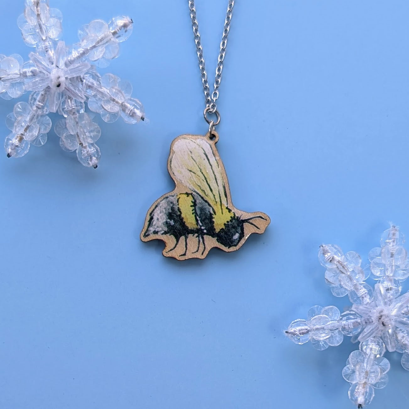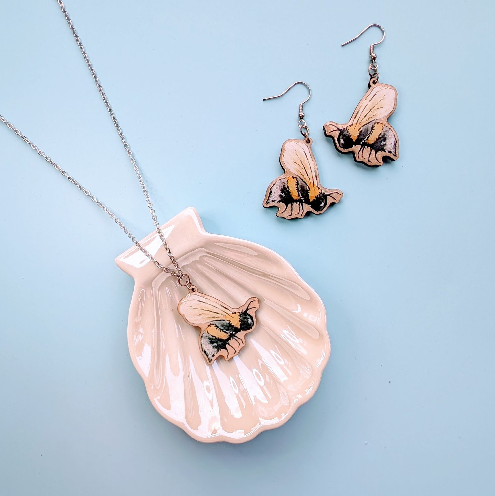 Introducing this beautiful double sided honey bee necklace, featuring the original artwork of me, Tara Pryor, painted originally in 2022. The print has been scanned in and UV printed onto FSC certified birch wood, making it really lightweight and comfortable to wear.