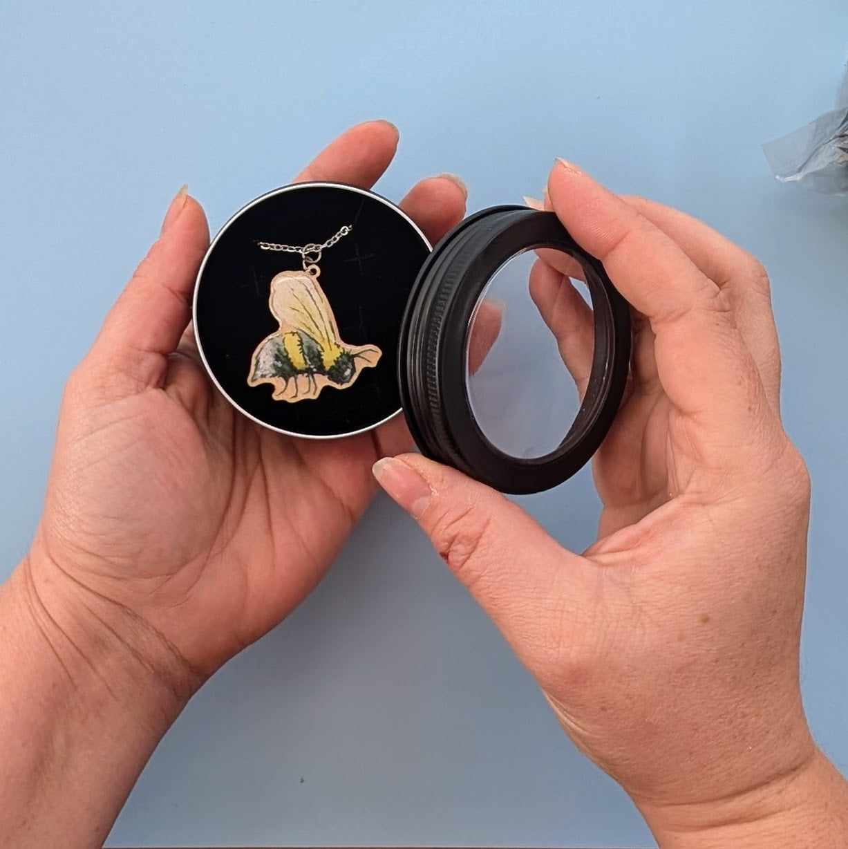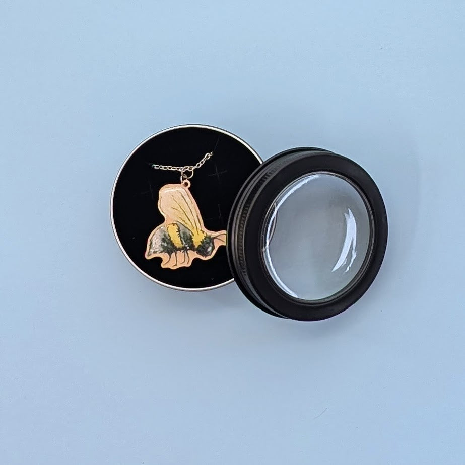 Discover the enchanting beauty of our bee necklace, a stunning piece featuring original artwork. Elegantly presented in our signature gift box tin, this necklace is not just an accessory but a statement of artistry and grace. Perfect for gifting or treating yourself, it captures the delicate essence of nature, making it a timeless addition to any jewellery collection. Embrace the charm and let this exquisite piece buzz into your life today.