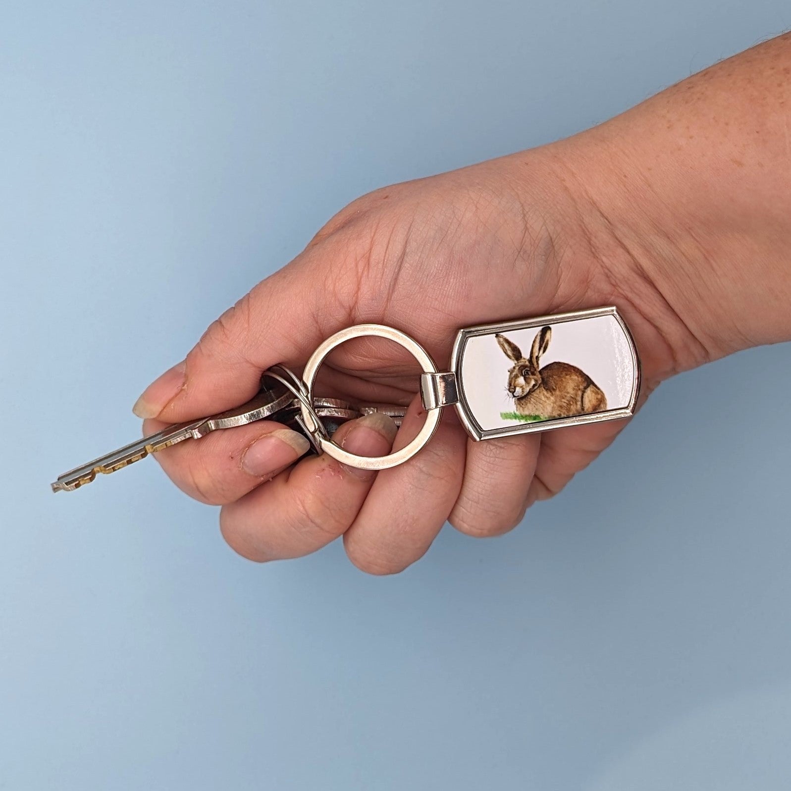 A stunning tag shaped Hare keyring featuring a print of the original watercolour "Hops" by Tara Pryor.