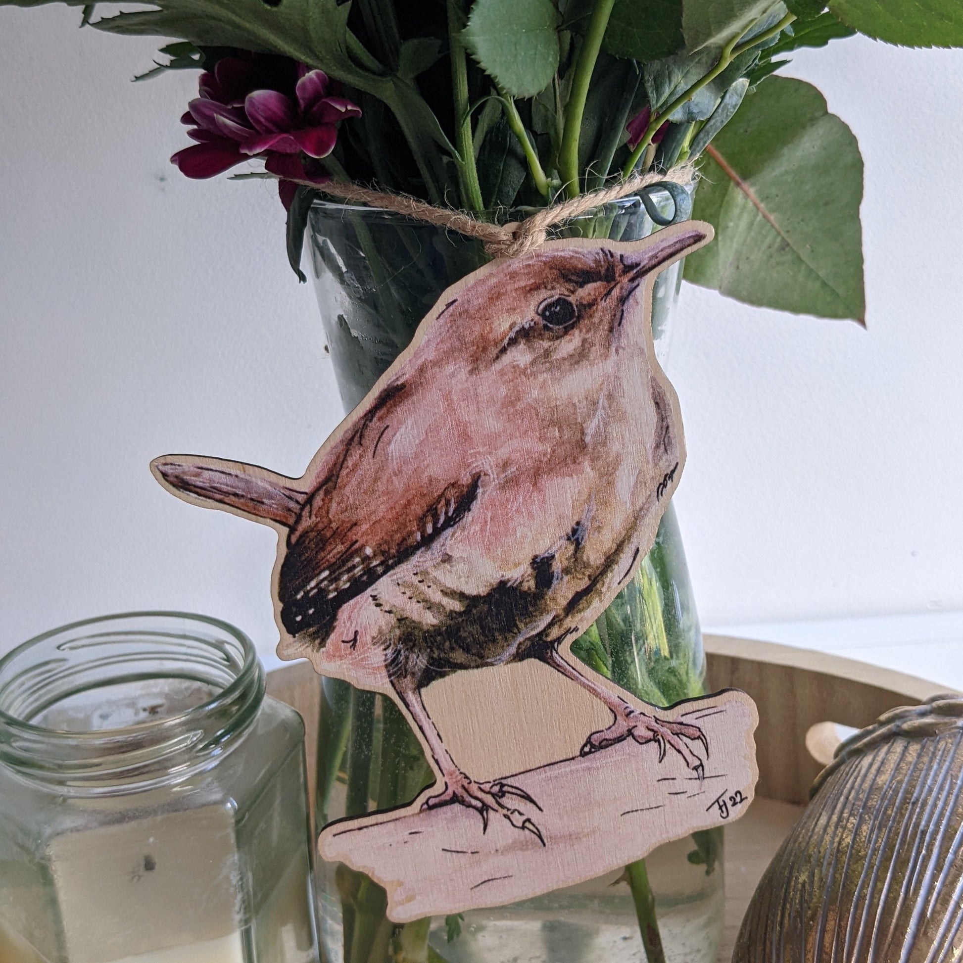 A beautiful hanging decoration featuring UV printed Wren from the original watercolour painting ''Jenny Wren''