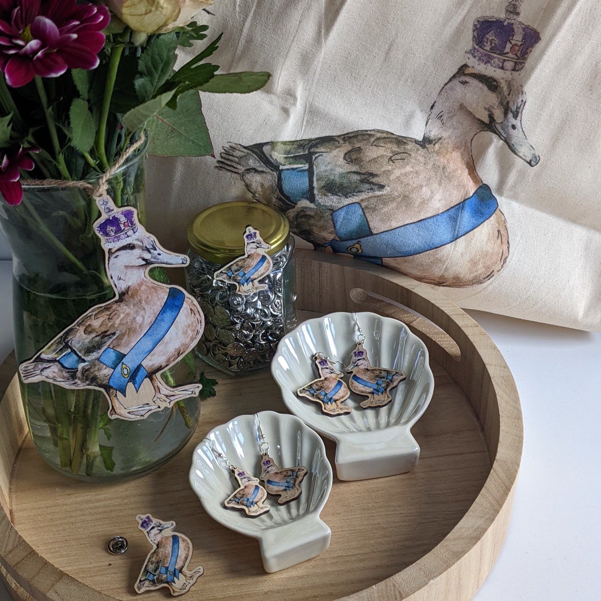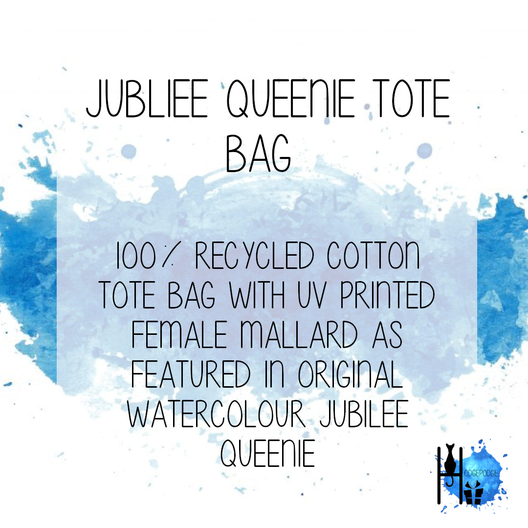 UV printed Tote Bag featuring a print of the original "Jubilee Queenie" watercolour painting of a female Mallard duck, created in celebration of the Queens Jubilee