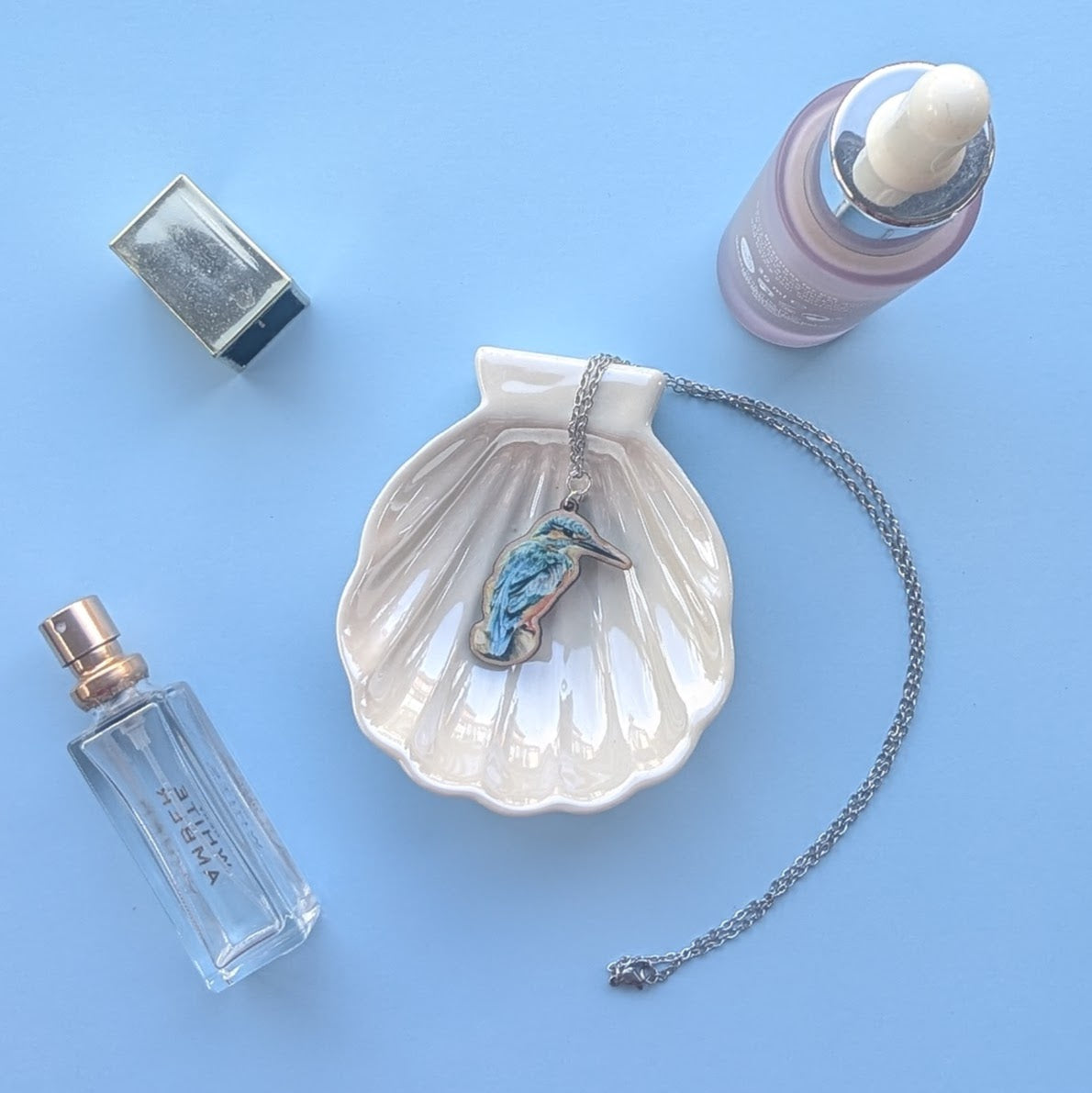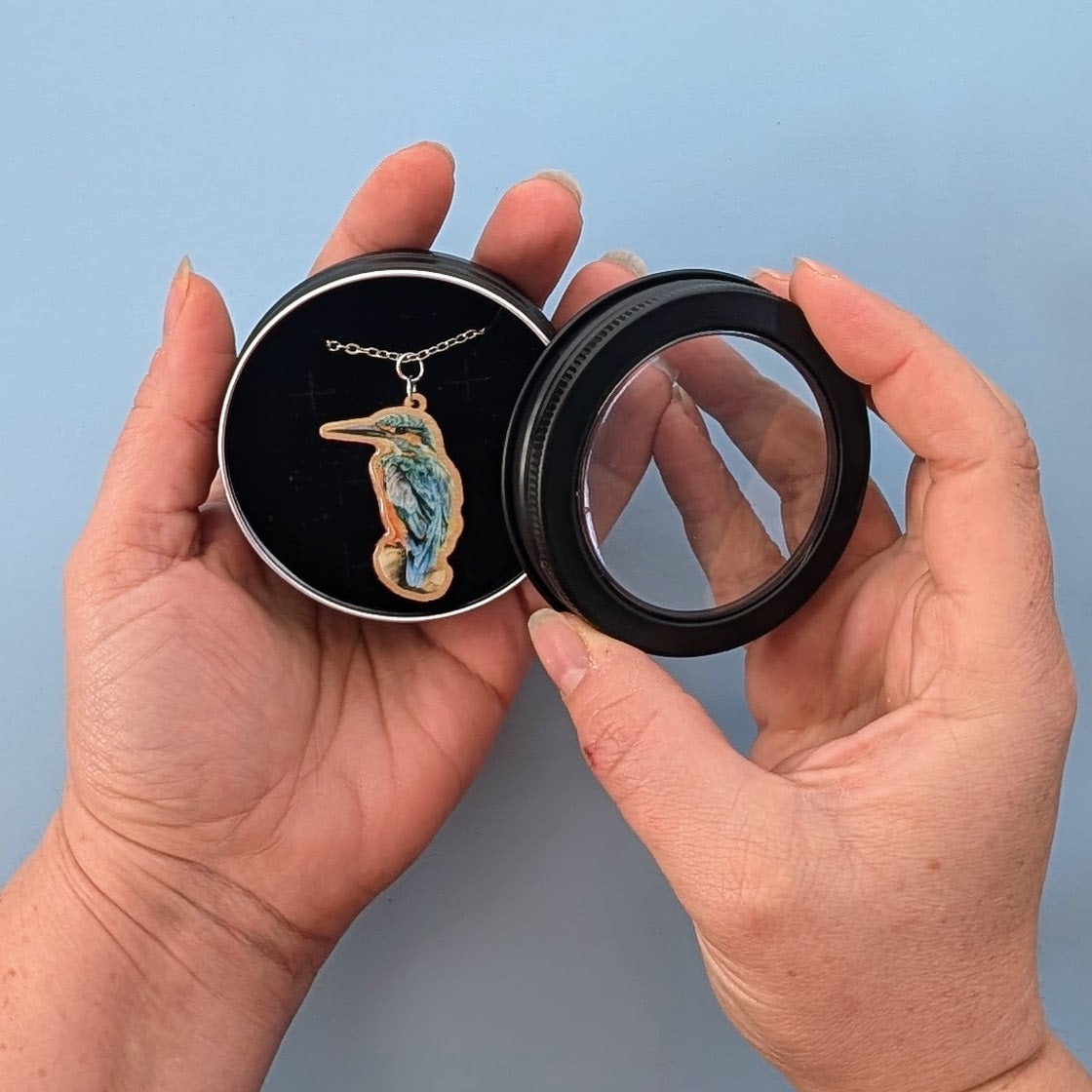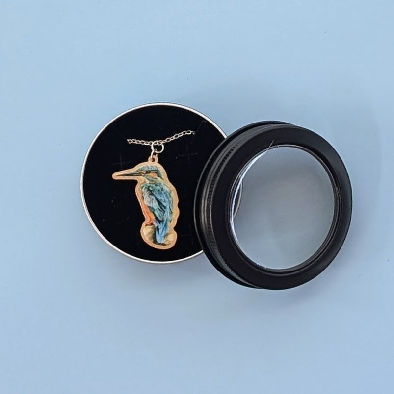 Introducing this beautiful double sided kingfisher necklace, featuring the original artwork of me, Tara Pryor, drawn originally in 2024. The print has been scanned in and UV printed onto FSC certified birch wood, making it really lightweight and comfortable to wear.