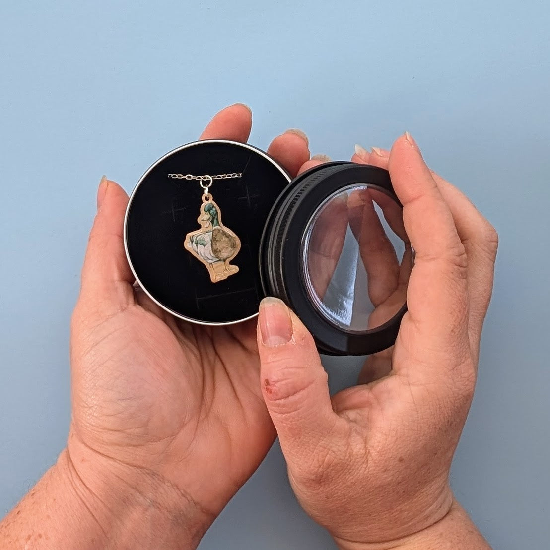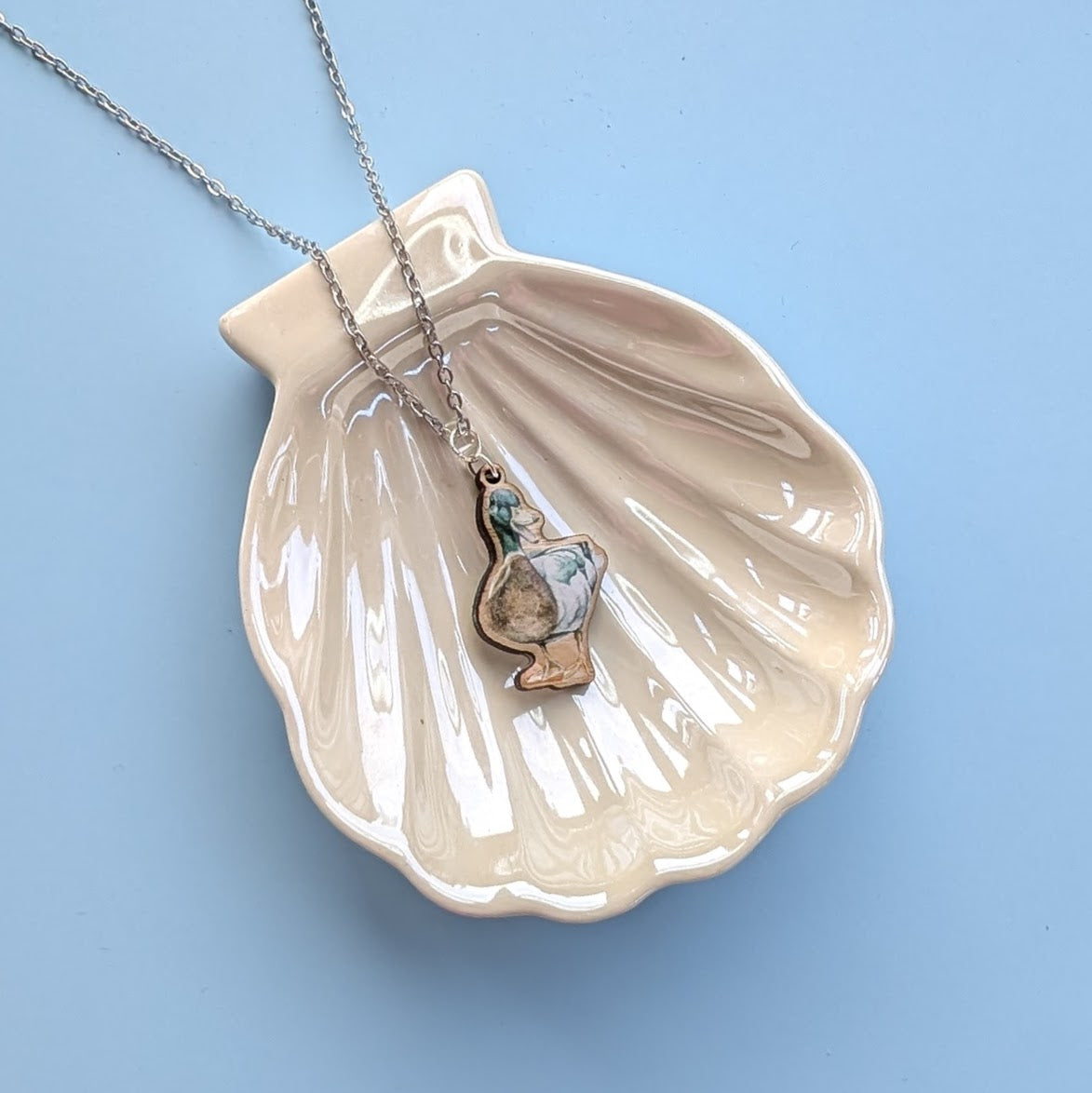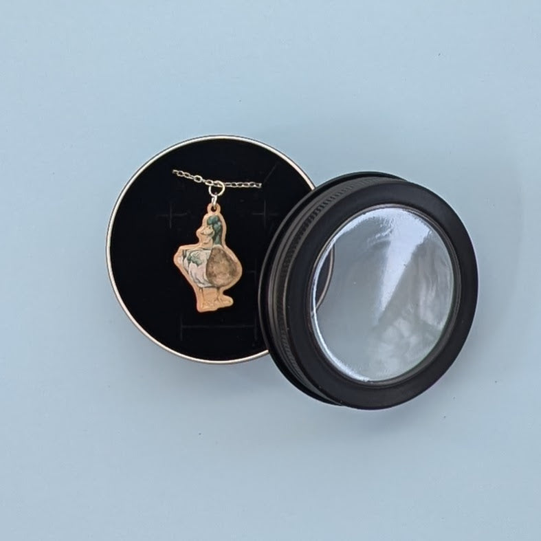 Introducing this beautiful double sided Mallard Duck necklace, featuring the original artwork of me, Tara Pryor, painted originally in 2021. The print has been scanned in and UV printed onto FSC certified birch wood, making it really lightweight and comfortable to wear.