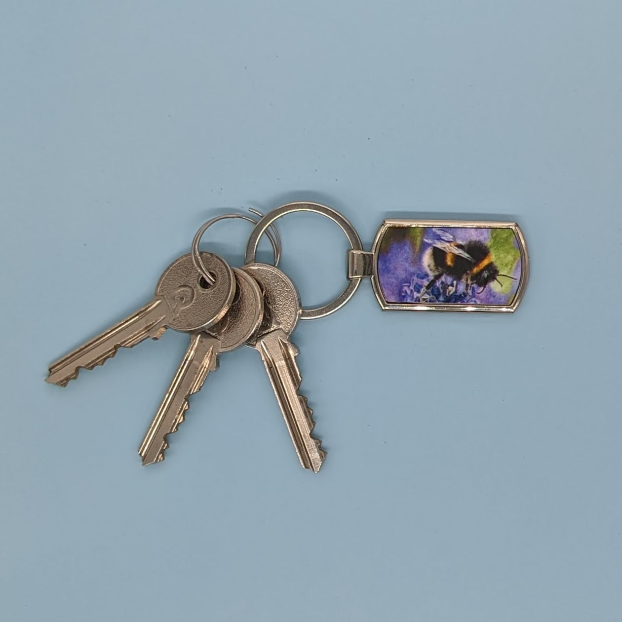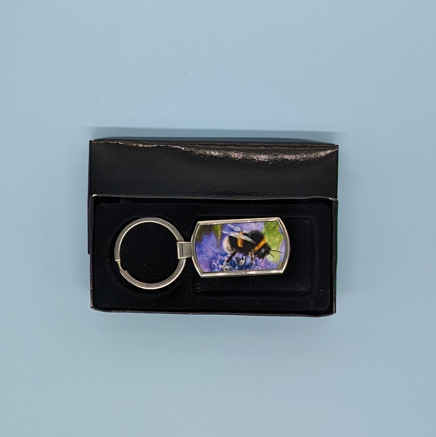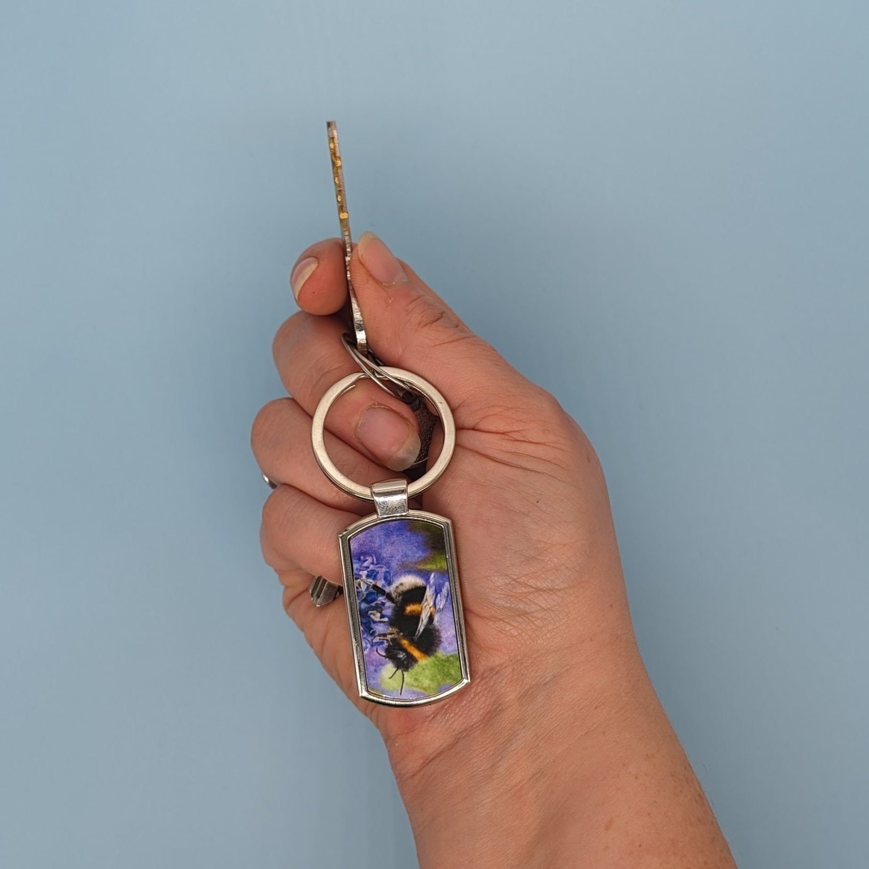A stunning tag shaped Bee keyring featuring a print of the original drawing "Lavender" by Tara Pryor.