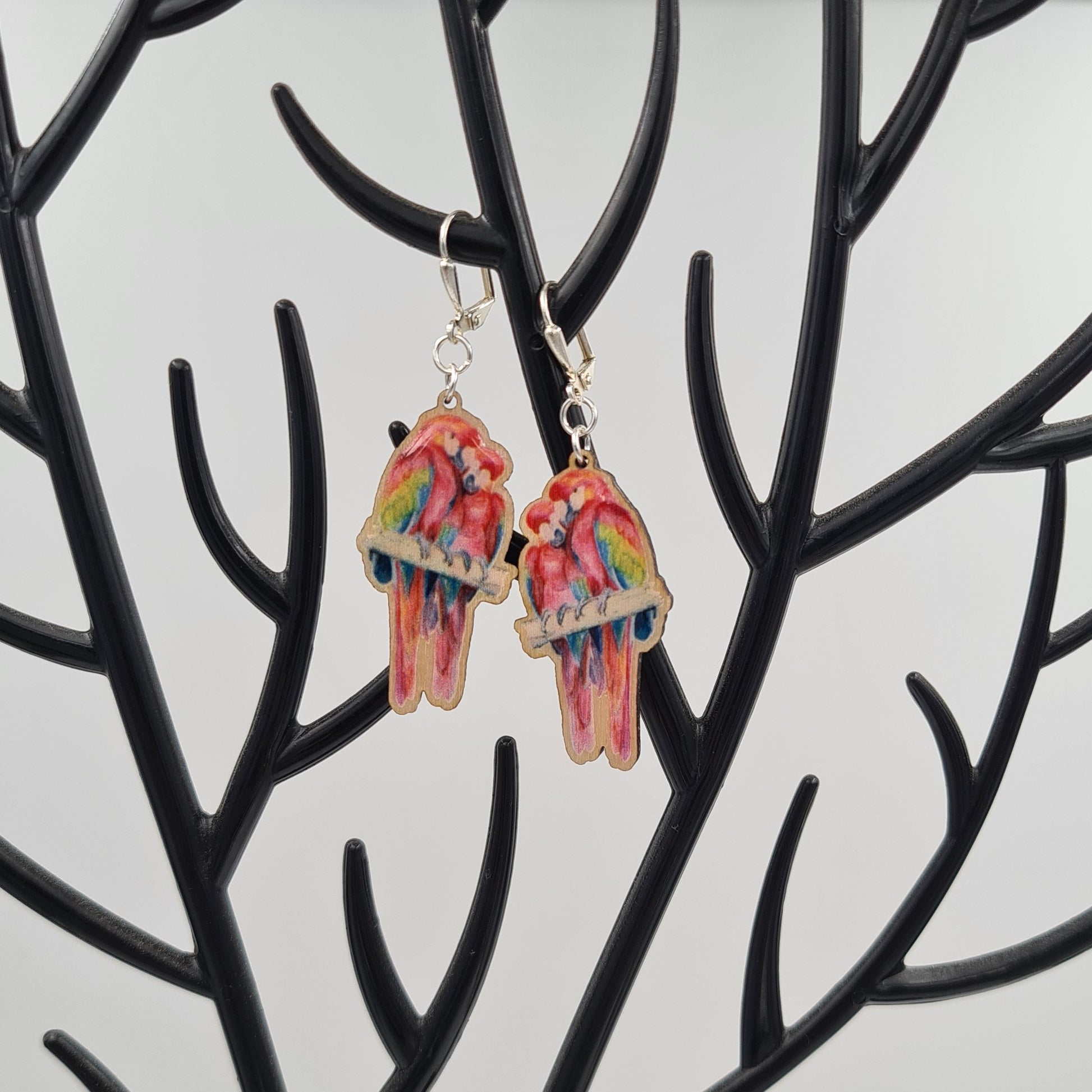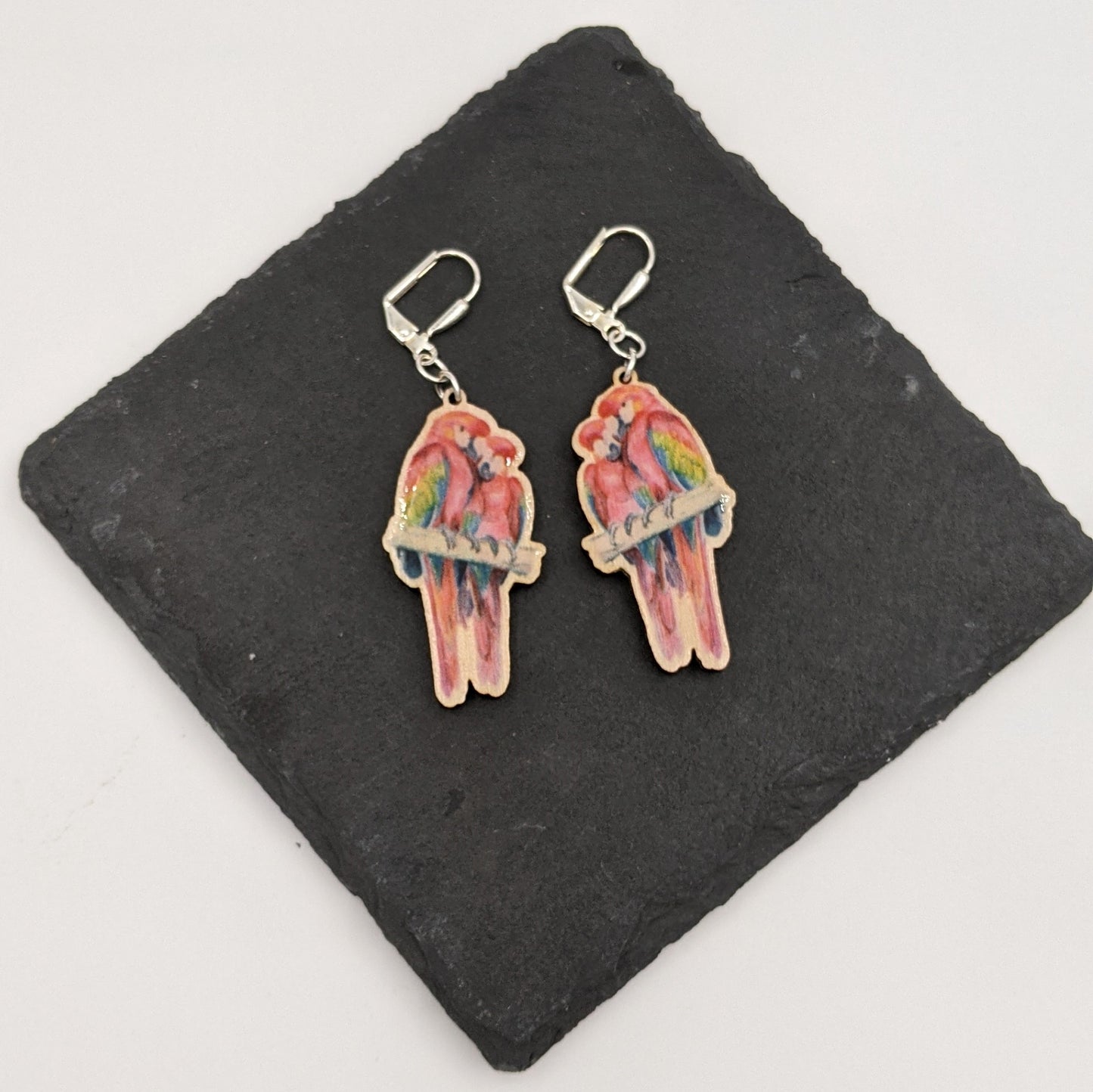 Each set of earrings is made using silver plated leaver back earring findings, with UV printed Macaws hanging down on sustainably sourced birch ply finished in a high sheen.