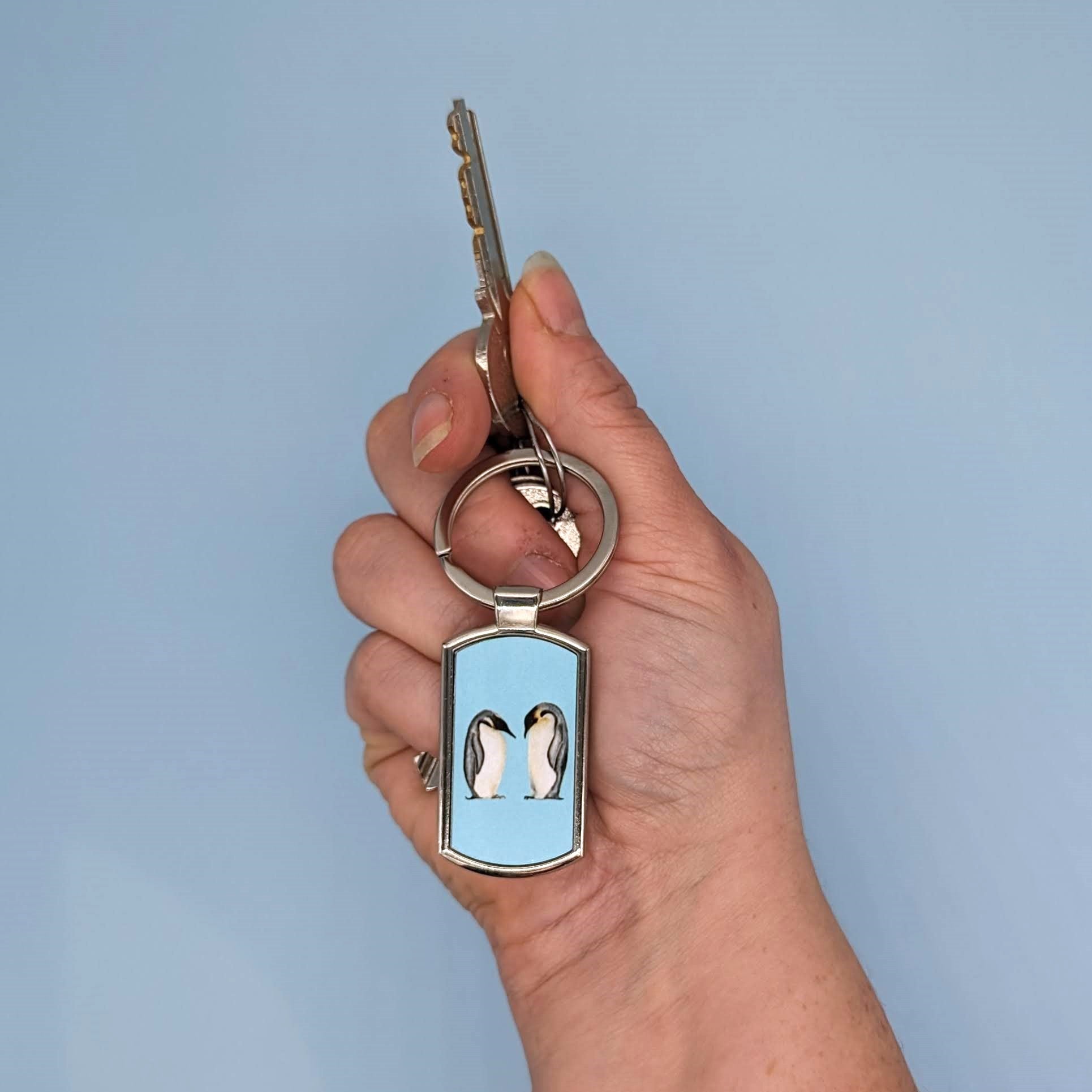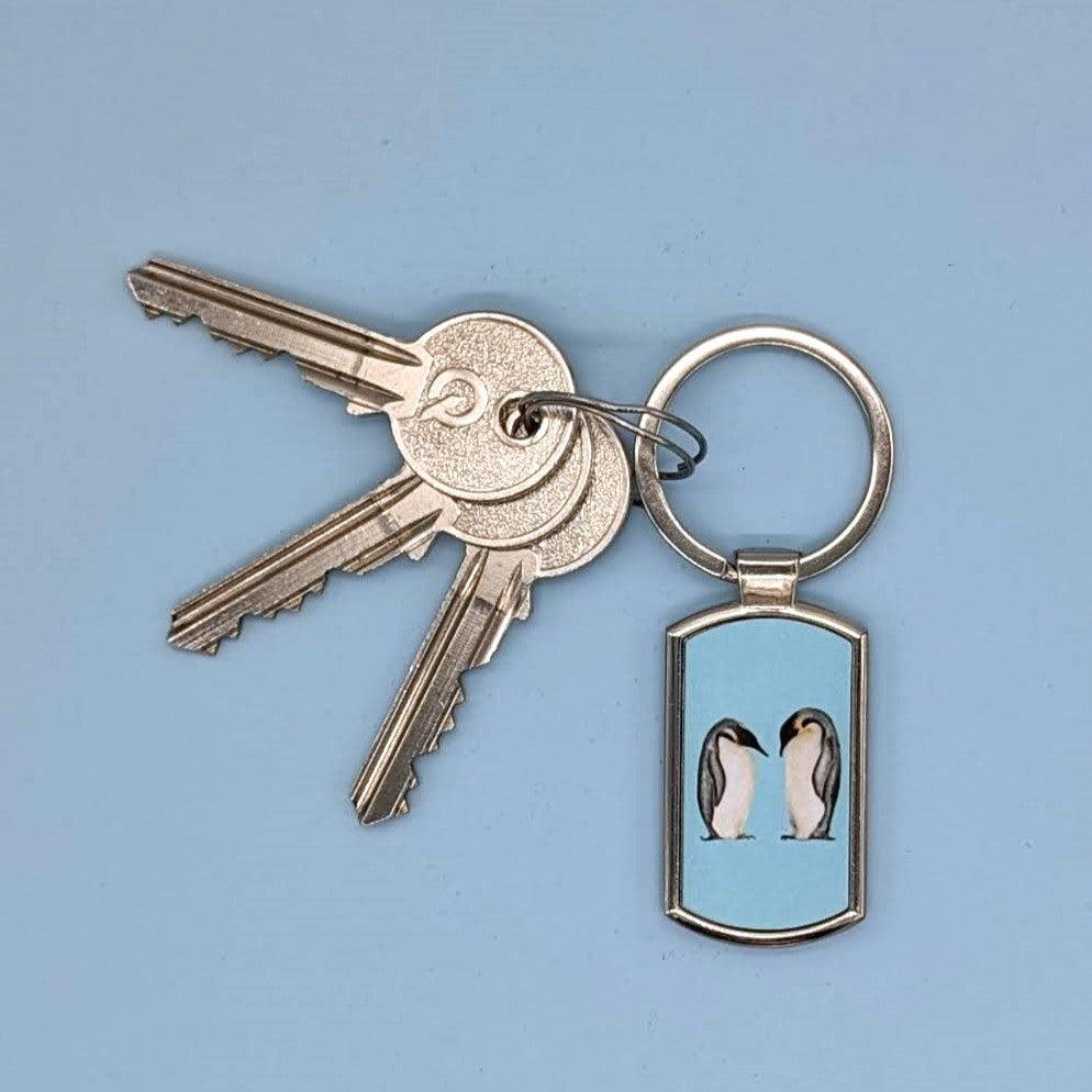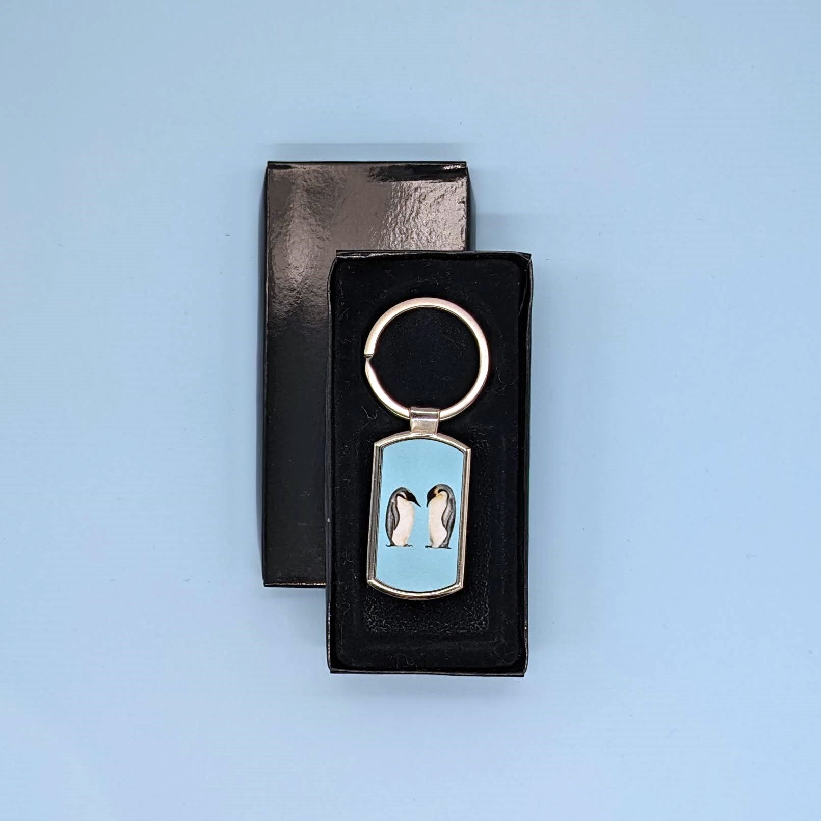 A stunning tag shape Penguin keyring featuring a print of the original watercolour "Under the Mistletoe" by Tara Pryor.