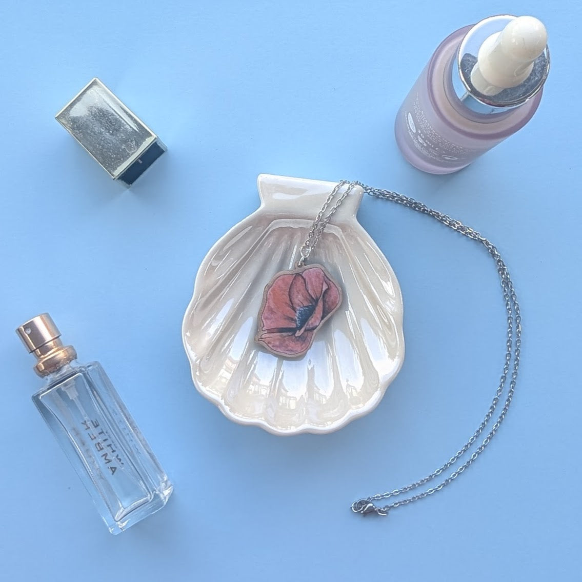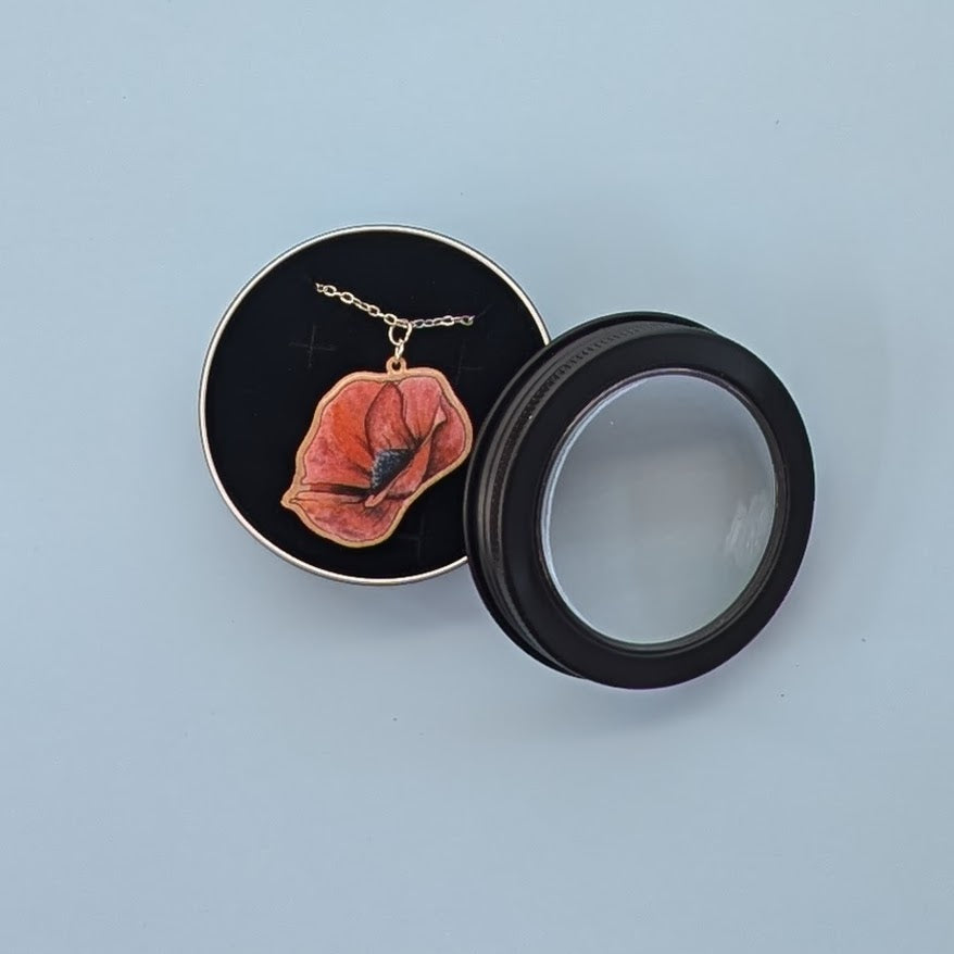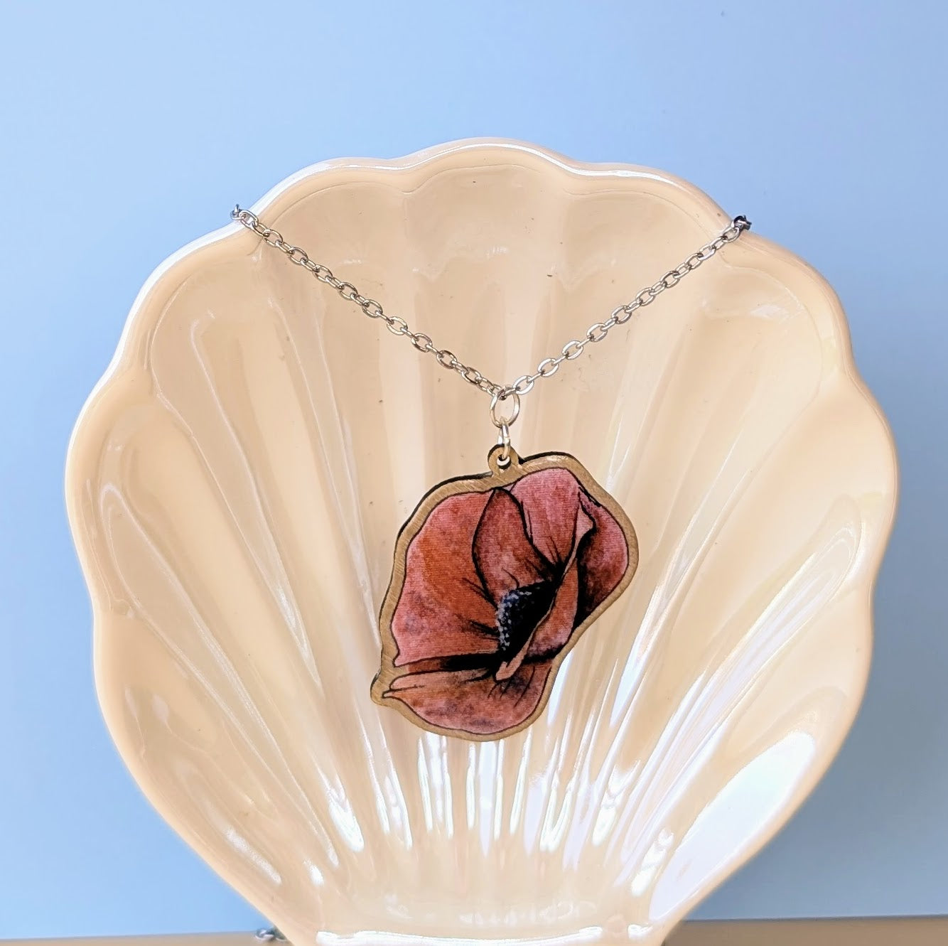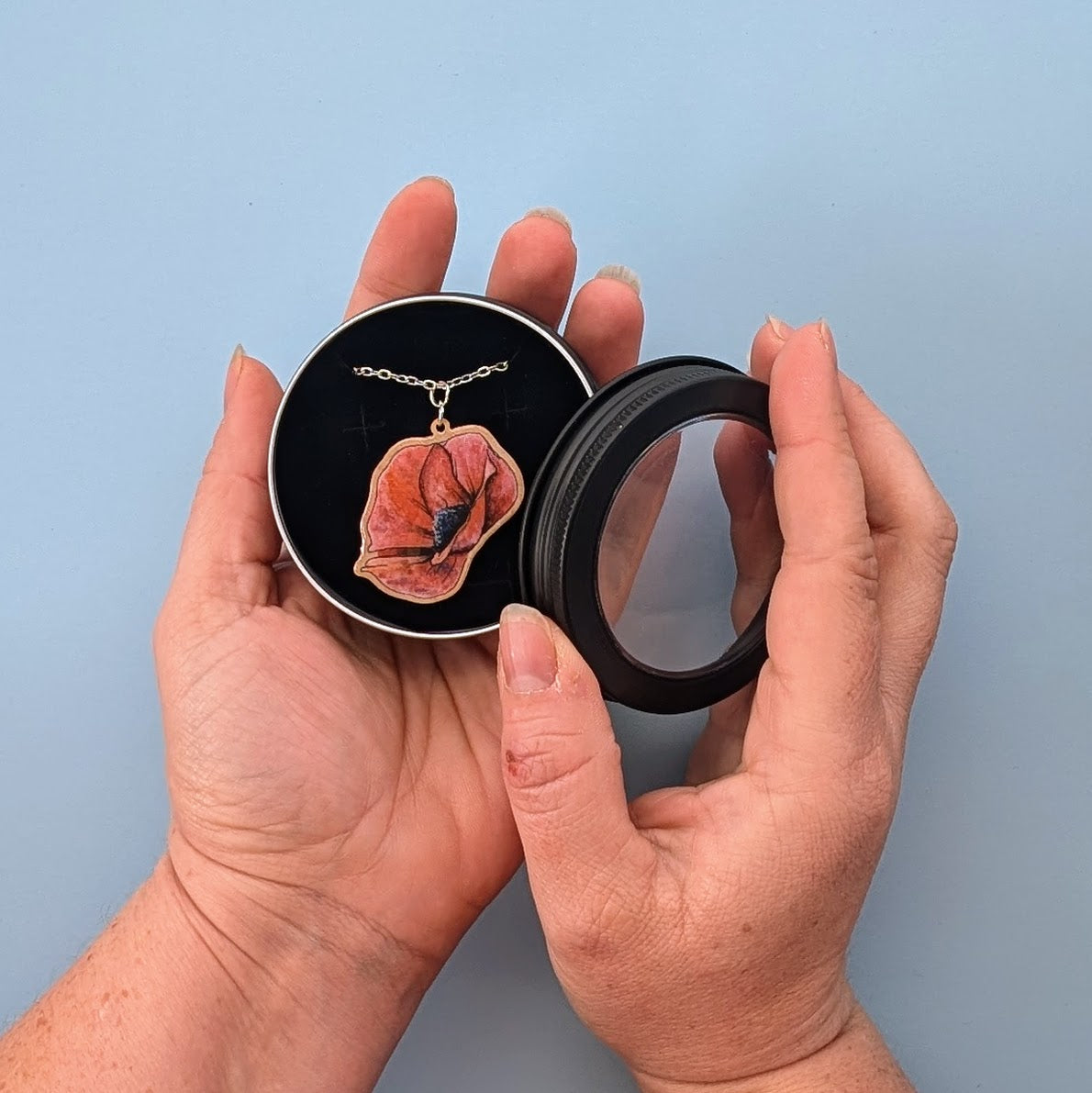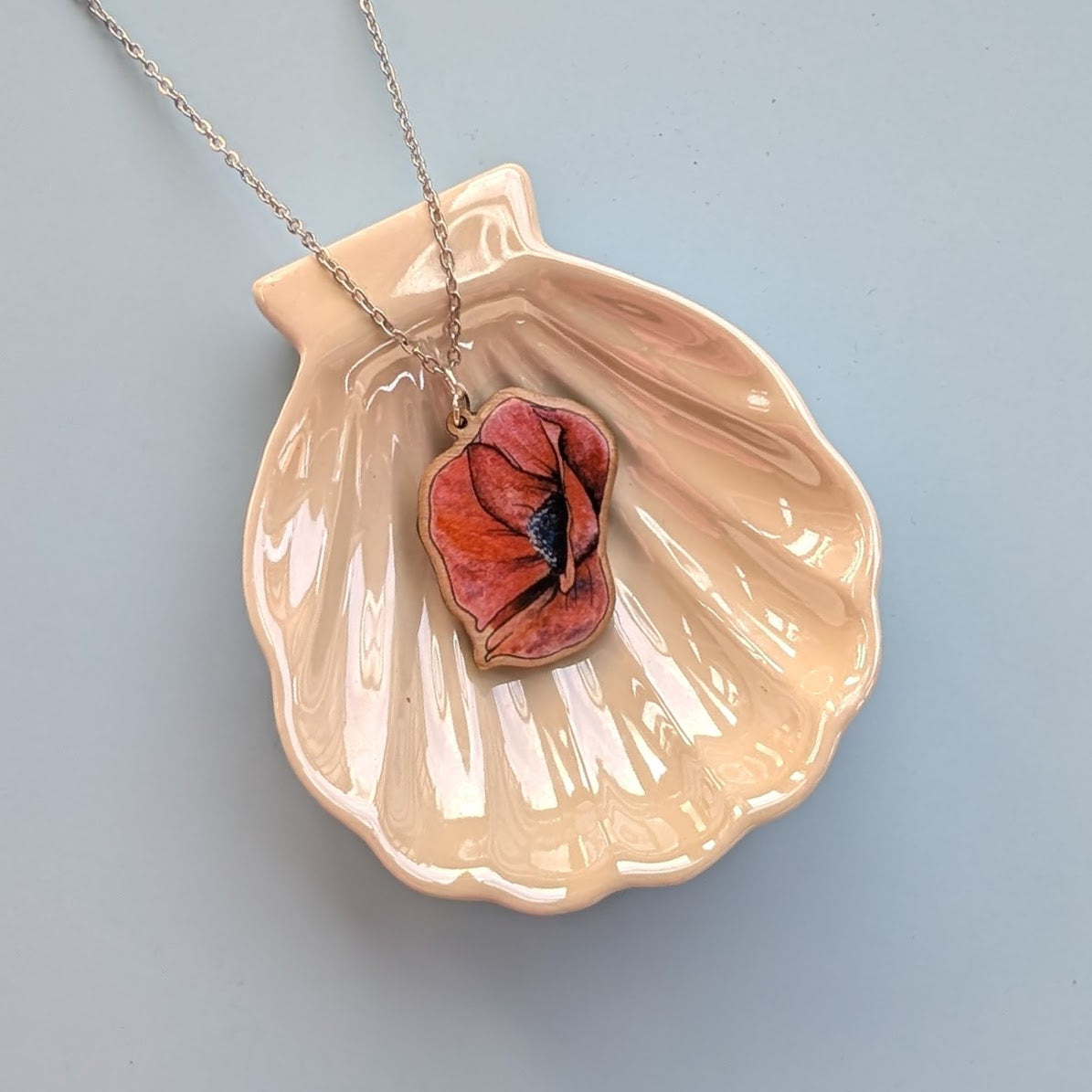 Introducing this beautiful double sided Poppy necklace, featuring the original artwork of me, Tara Pryor, painted originally in 2023. The print has been scanned in and UV printed onto FSC certified birch wood, making it really lightweight and comfortable to wear.