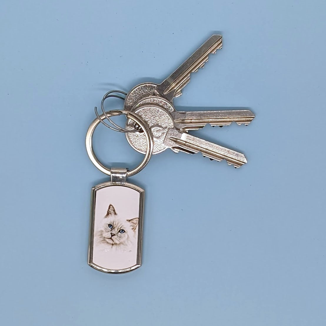 A stunning tag shaped White Cat keyring featuring a print of the original drawing "Sapphire" by Tara Pryor.