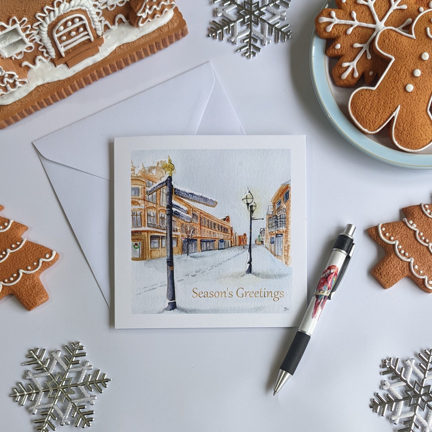 Blank Greetings card featuring a watercolour image of "Seasons Greetings from Stafford" a winter scene of Stafford Town centre in Staffordshire UK, originally painted by Tara in 2022.