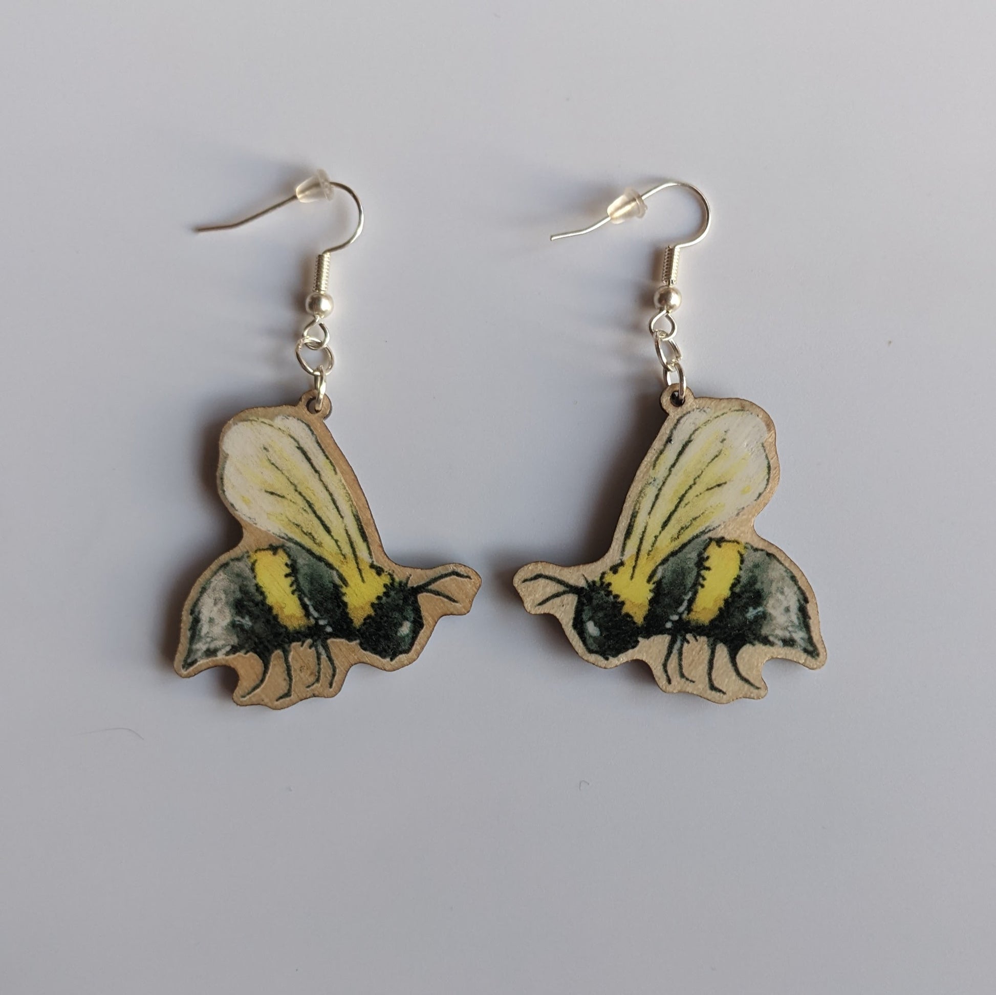 Each set of earrings is made using silver plated fish hook earring findings, with UV printed bees hanging down on sustainably sourced birch ply finished in a high sheen.