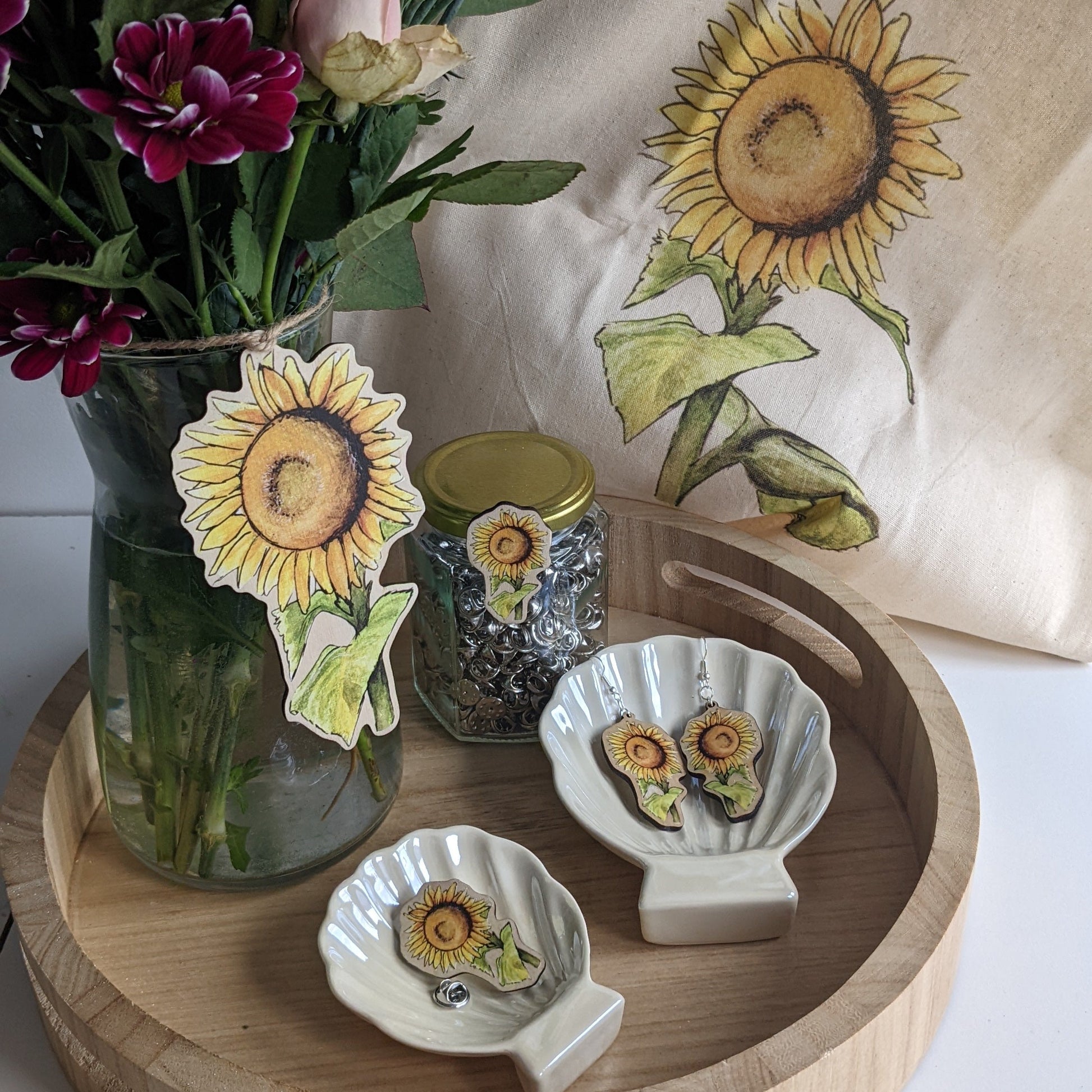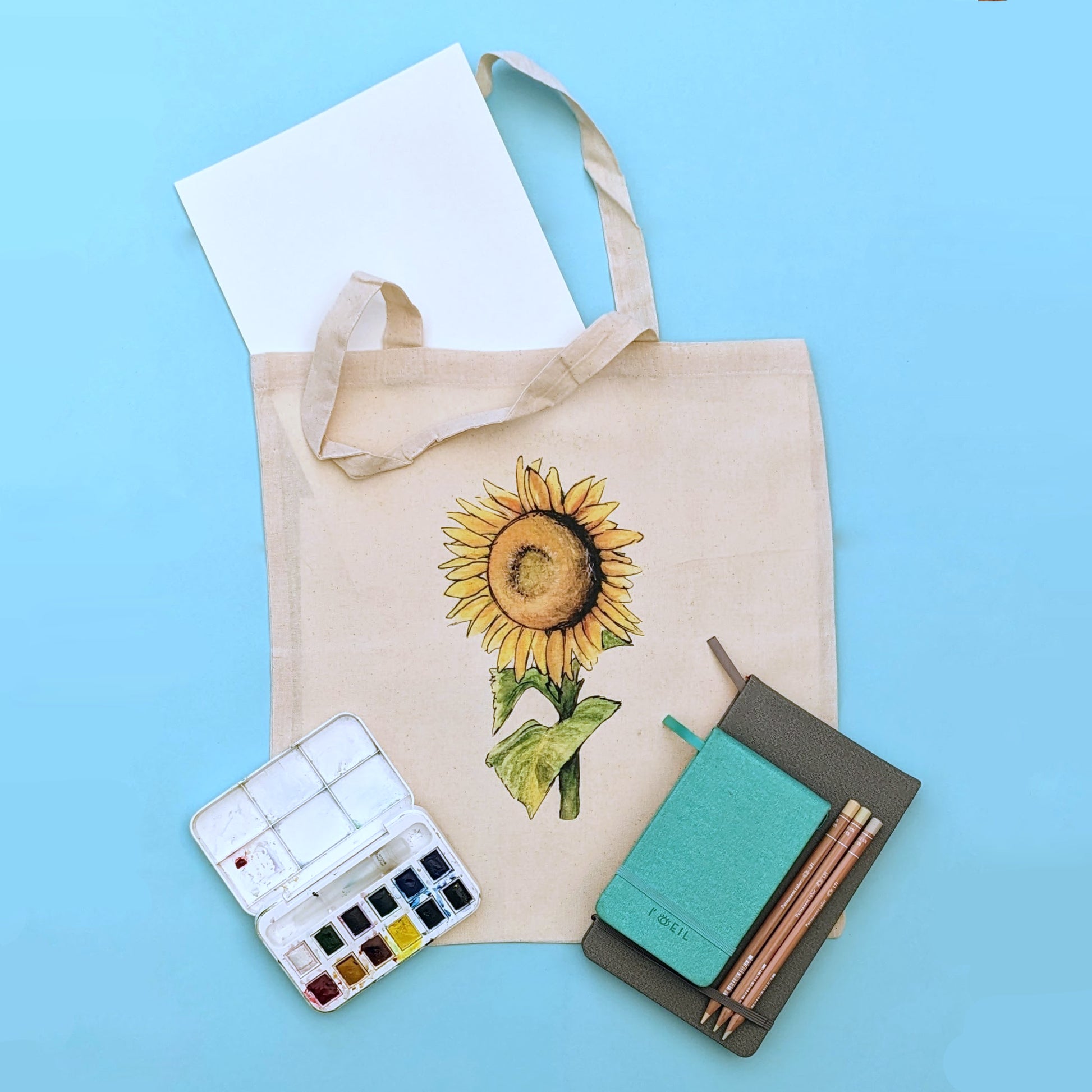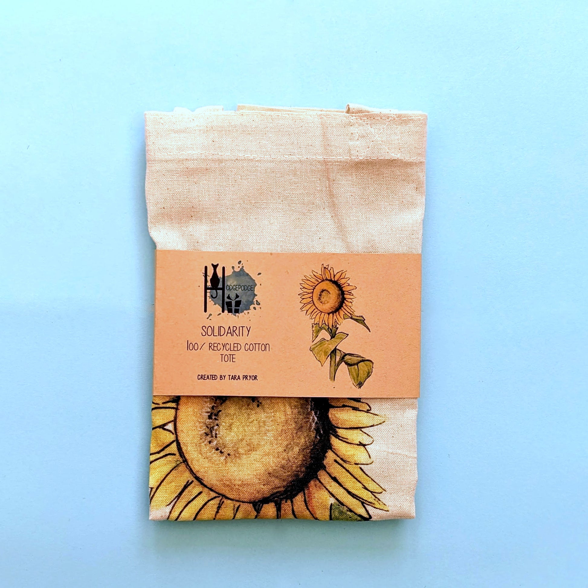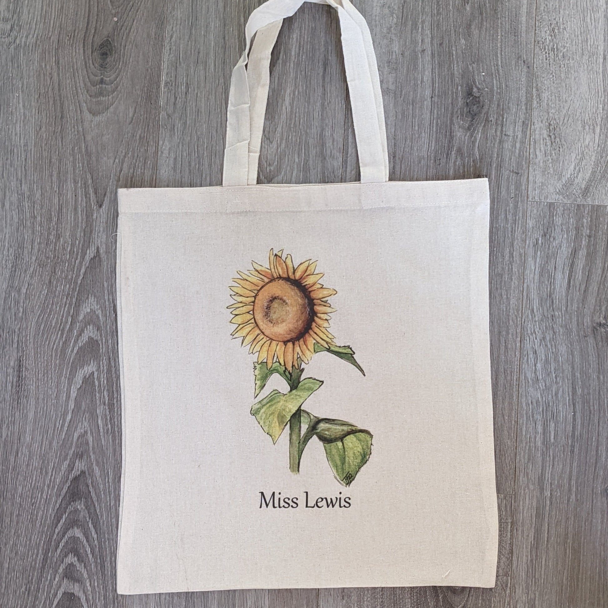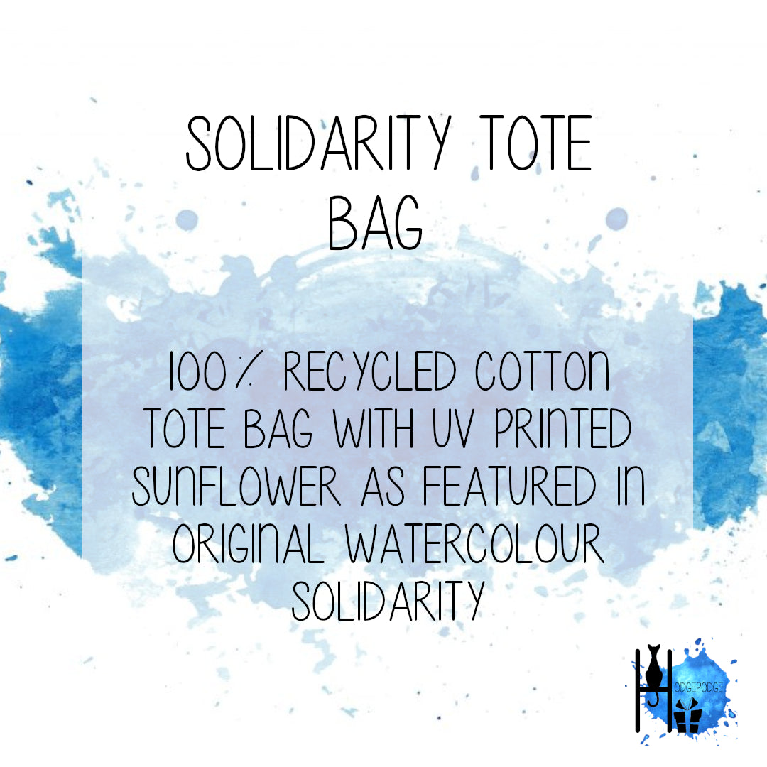 UV printed Tote Bag featuring a print of the original "Solidarity" watercolour painting of a sunflower, These can be personalised with a name, or left on their own.