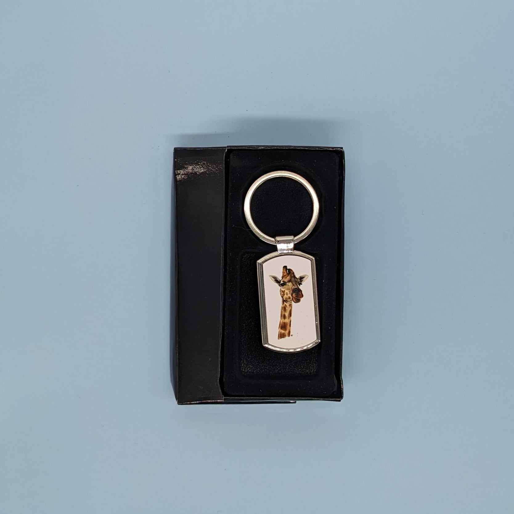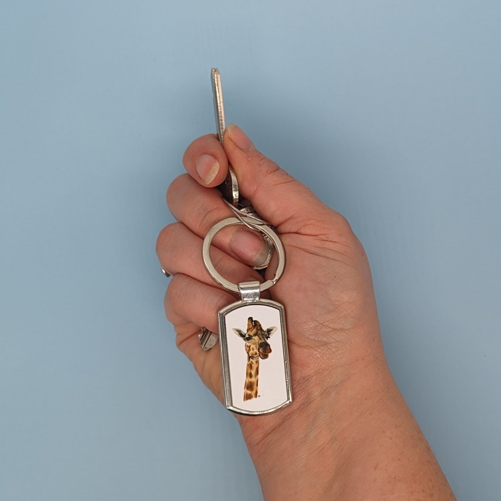 A stunning tag shaped Giraffe keyring featuring a print of the original watercolour "Stand Tall" by Tara Pryor.