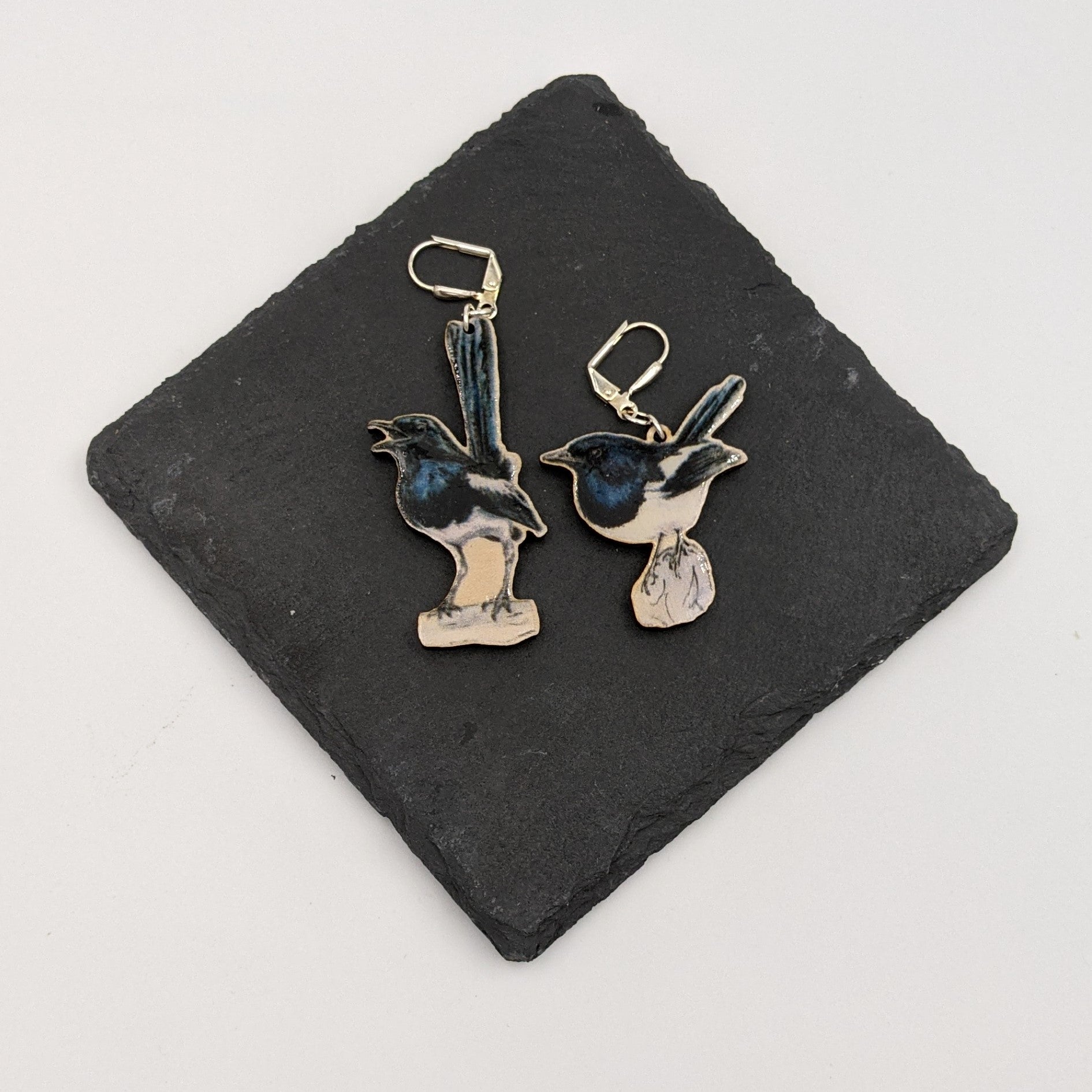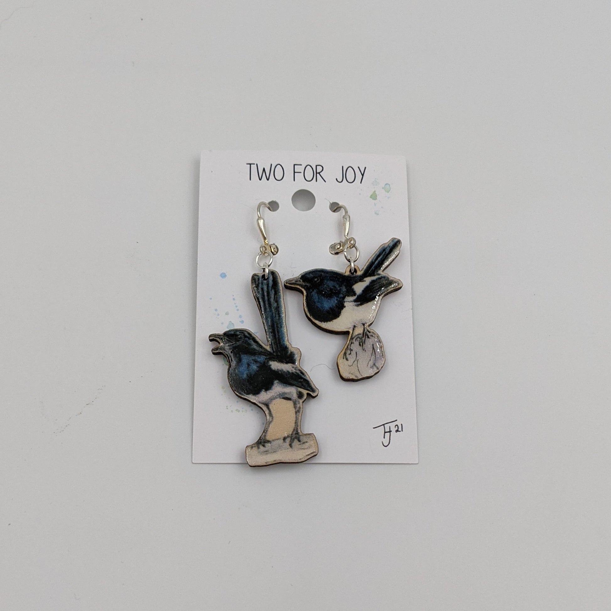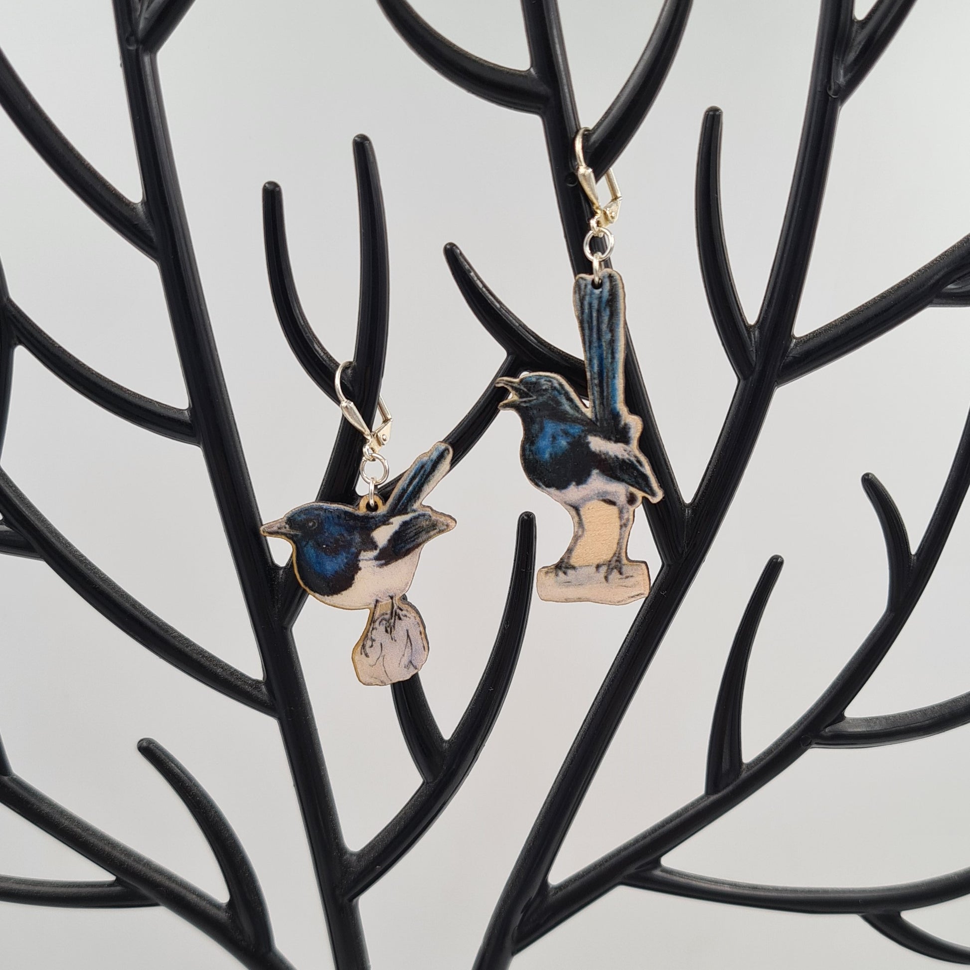 Each set of earrings is made using silver plated leaver back earring findings, with UV printed Magpies hanging down on sustainably sourced birch ply finished in a high sheen.