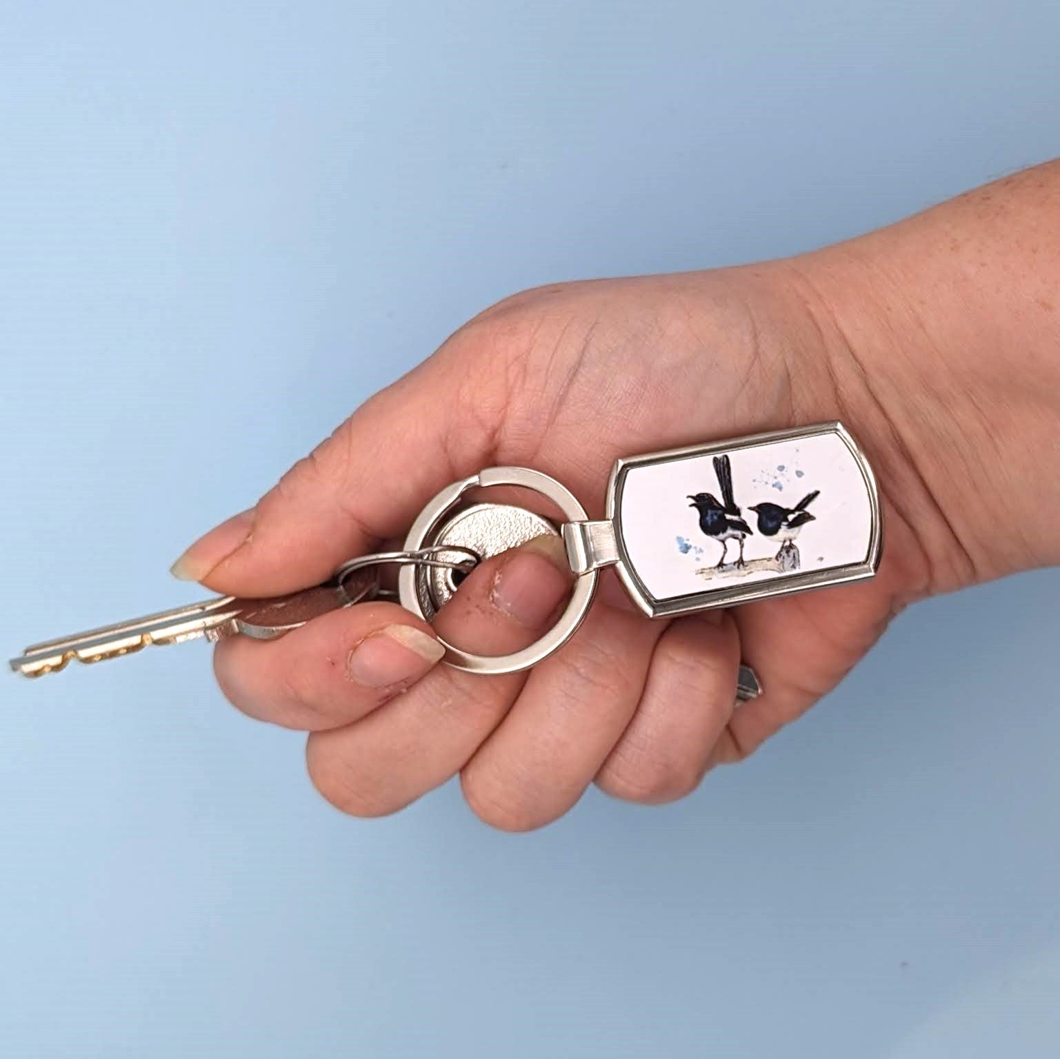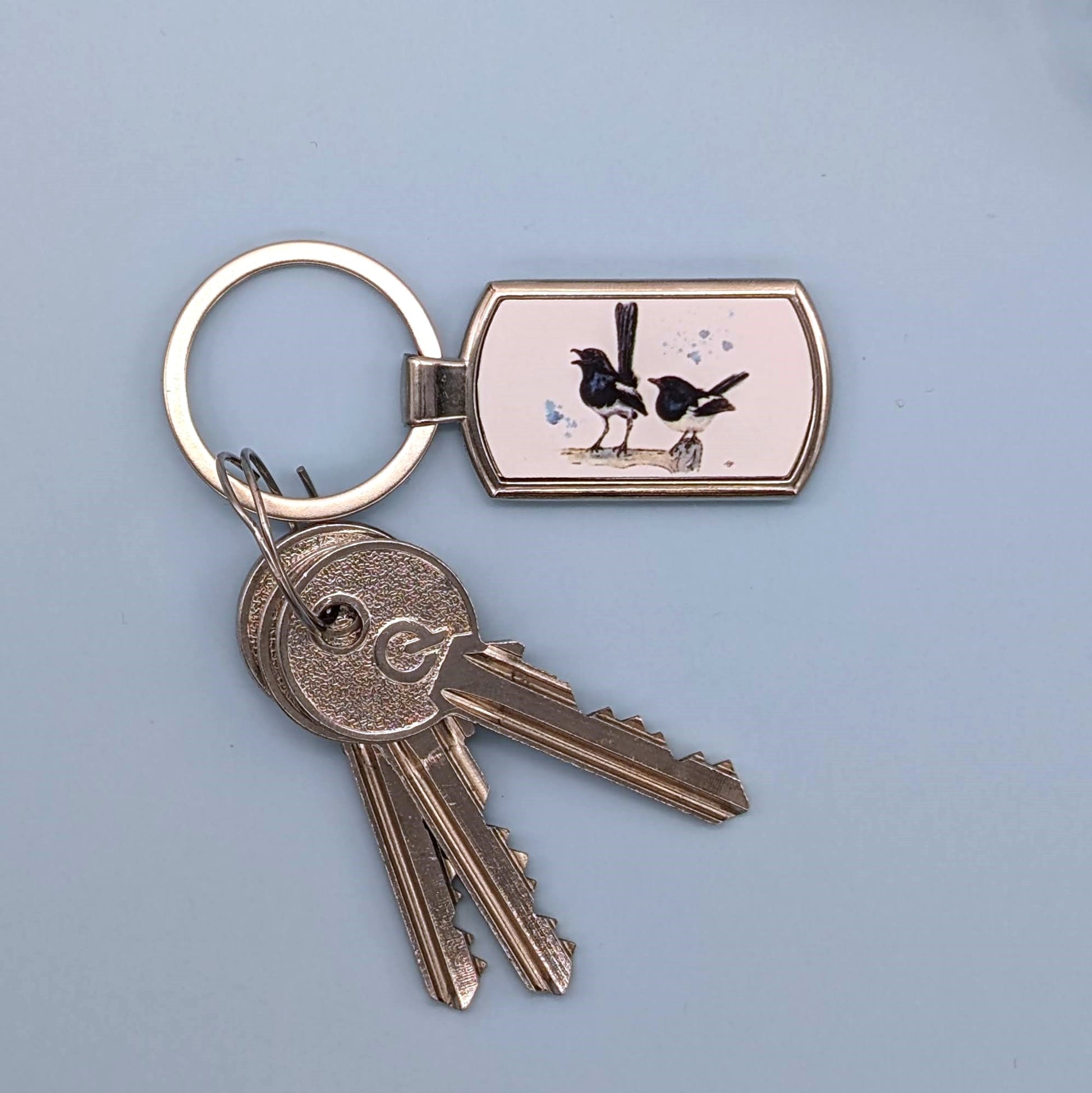 A stunning tag shaped Magpie keyring featuring a print of the original watercolour "Two for Joy" by Tara Pryor.