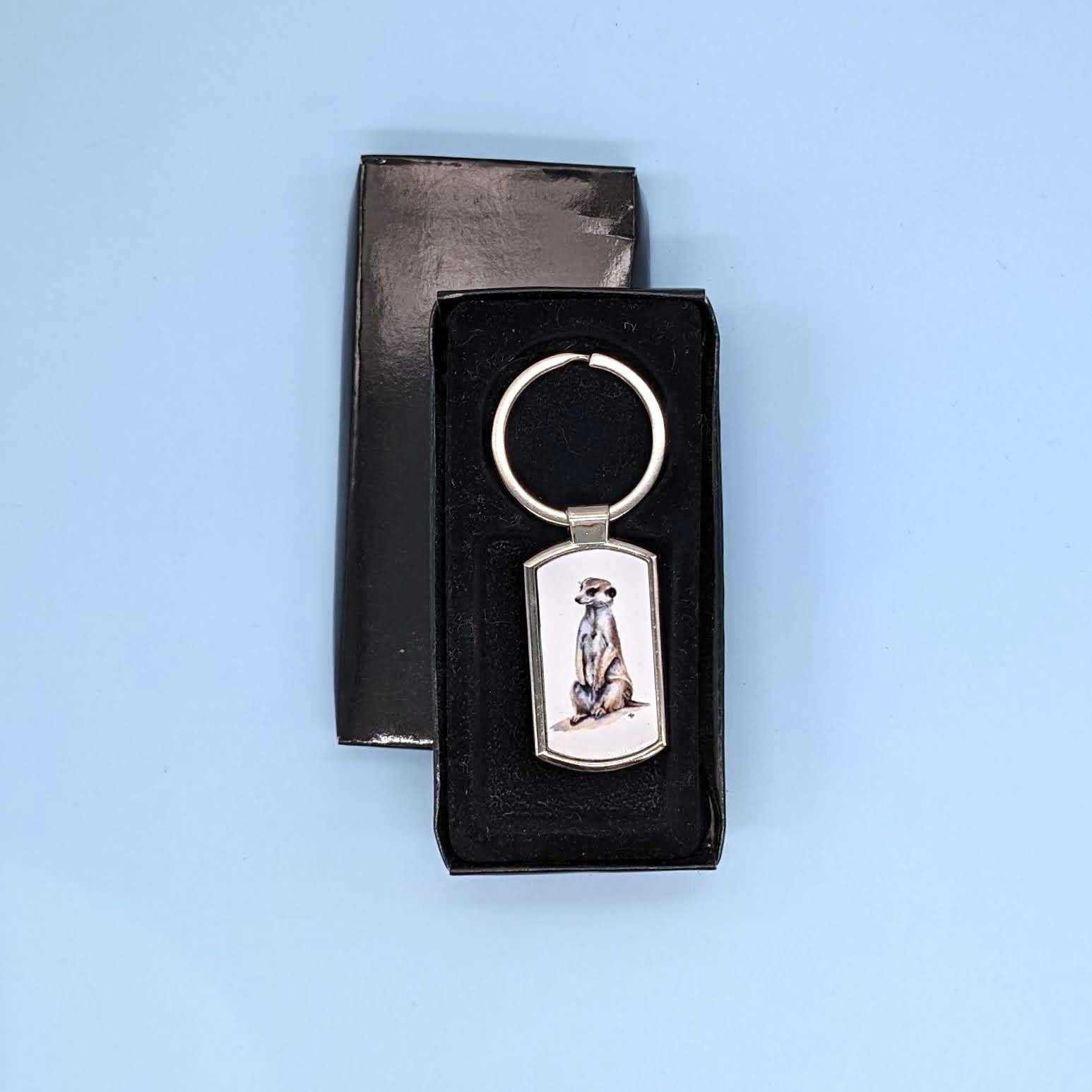 A stunning tag shaped Meerkat keyring featuring a print of the original watercolour "Ubunifu" by Tara Pryor.
